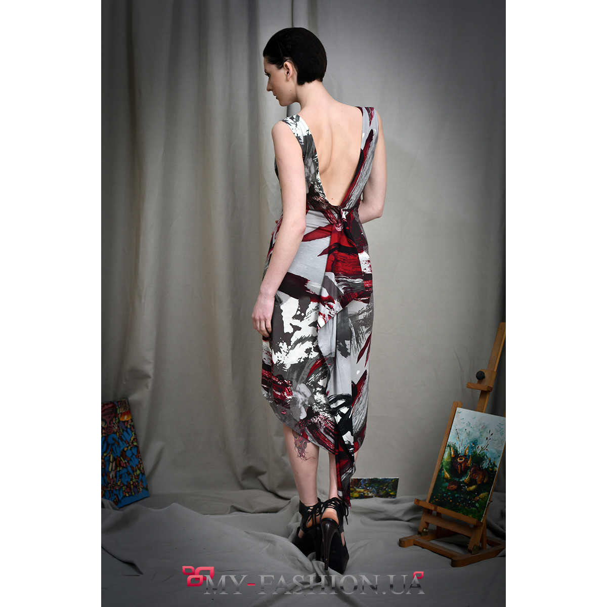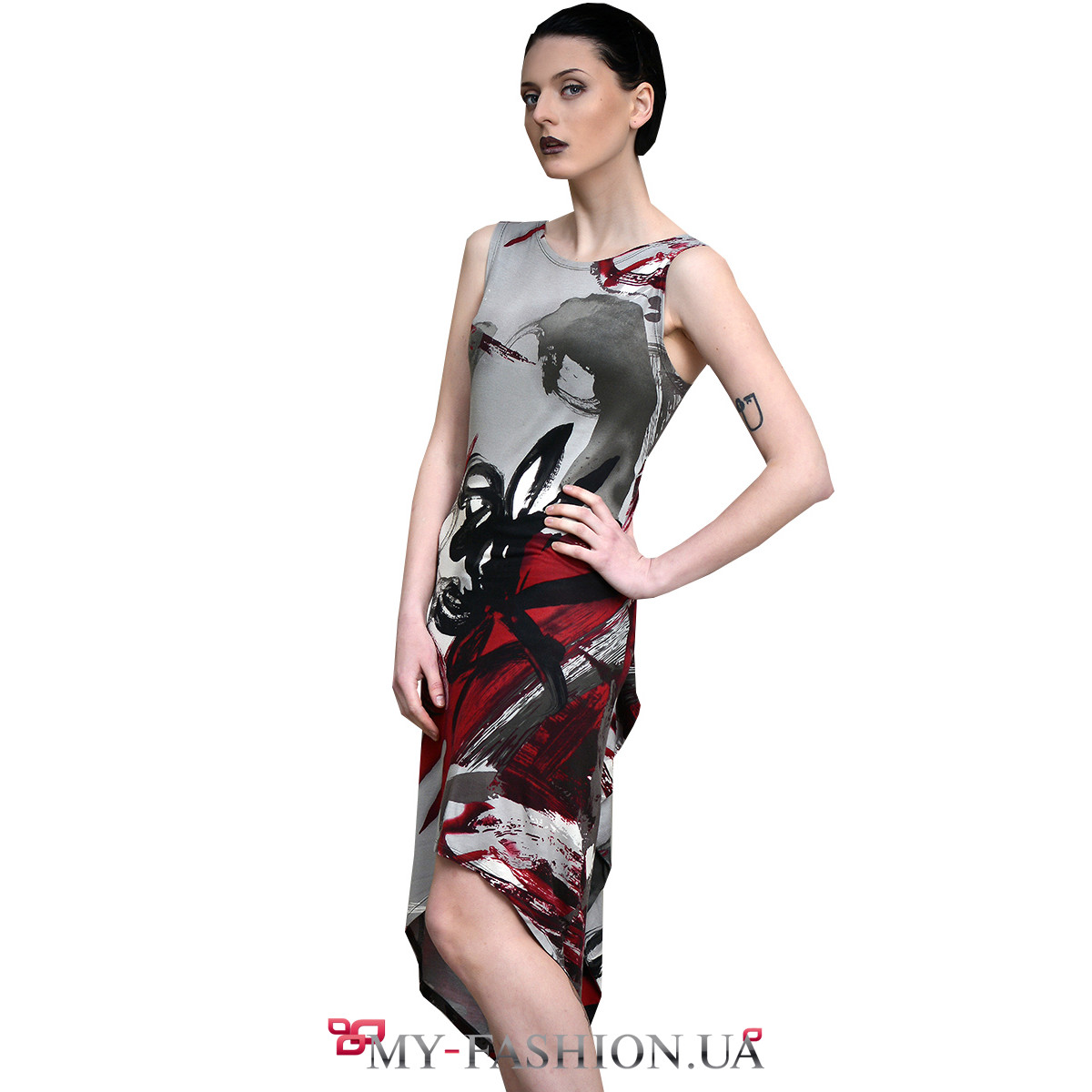 Оригинальное вечернее платье из приятного на ощупь трикотажа подарит комфорт и хорошее настроение. Благодаря яркому принту на ткани, изделие выглядит завершённо даже без дополнительных аксессуаров. Платье обтягивающее, без рукавов, на широких бретелях. Вырез горловины спереди полукруглый и неглубокий; на спинке — большой треугольный. Асимметричная юбка спереди открывает колени, а сзади касается щиколоток изящным хвостиком. Состав: хлопок, вискоза. Доступные размеры: 36, 38. Может быть изготовлено на заказ в любом размере по вашим индивидуальным меркам.