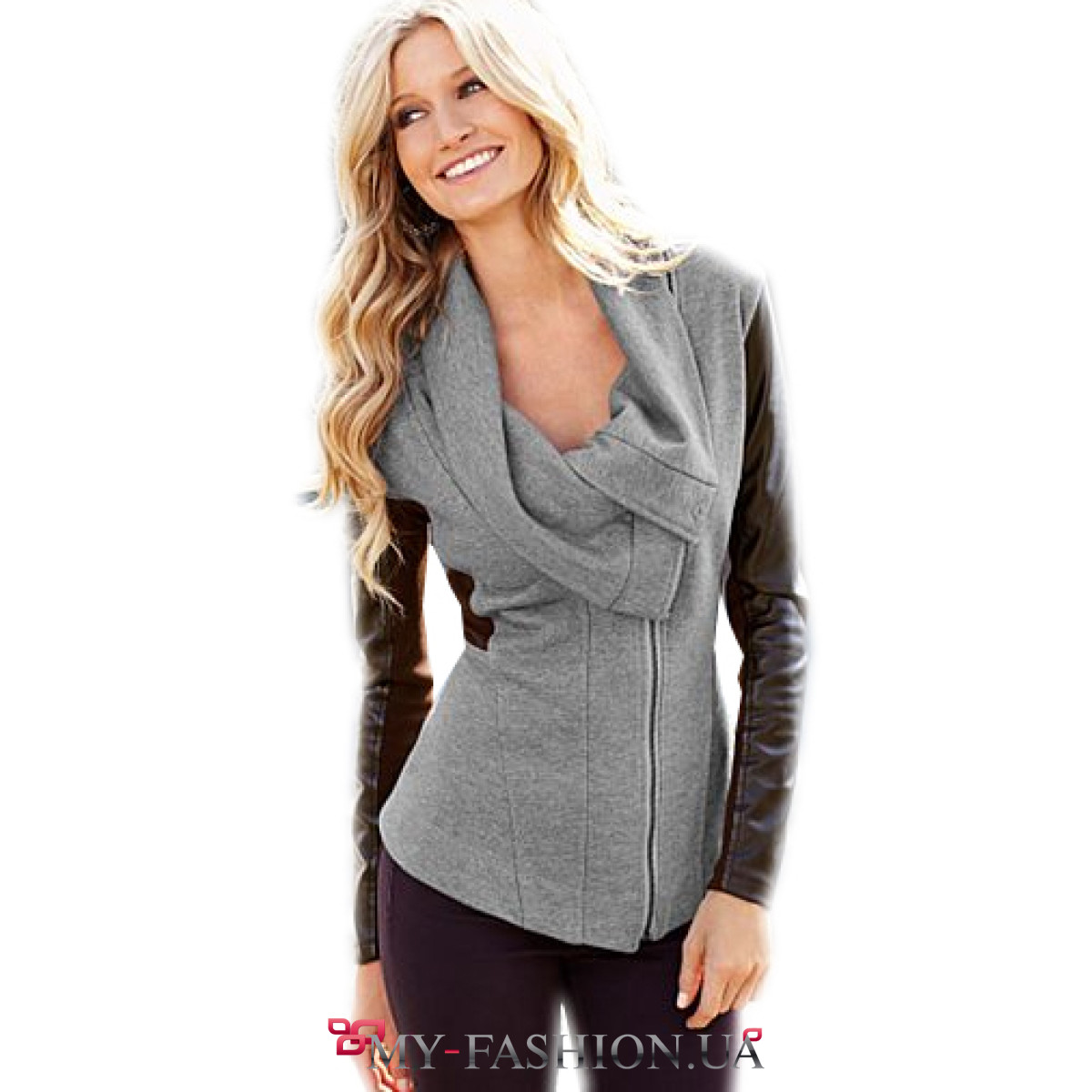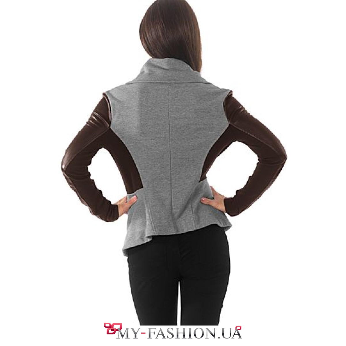 Красивый приталенный трикотажный пиджак станет прекрасным дополнением к повседневному наряду в прохладную погоду. Закрывается на удобную металлическую молнию спереди. Изделие имеет крупный отложной воротник оригинального кроя, который можно выкладывать на ваш вкус. Асимметричный низ в сочетании с узкими рукавами из экокожи создают неповторимый стильный внешний вид. Материал: трикотаж, экокожа. Можно изготовить на заказ в любом необходимом размере.