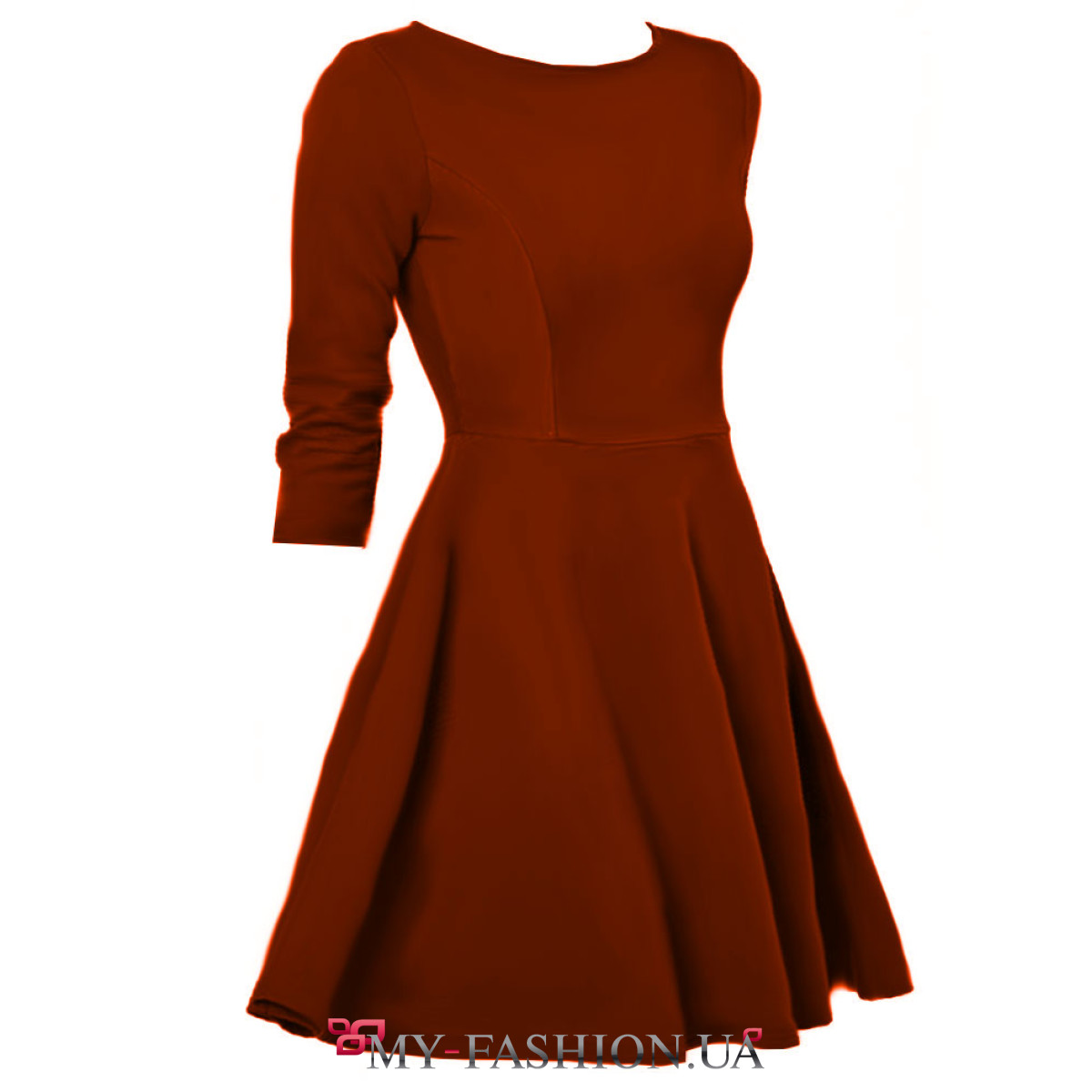 Красивое платье классического кроя с расклешённой юбкой прекрасно сядет на худеньких девушек и поможет создать яркий незабываемый летний образ. Полочка изделия строго приталена, рельефные швы обеспечивают максимально плотную посадку по фигуре. Рукава три четверти хорошо сочетаются с неглубоким полукруглым вырезом горловины. Застёгивается на потайную молнию на спинке. Материал: хлопковый трикотаж. Можно выполнить на заказ в любом необходимом размере.