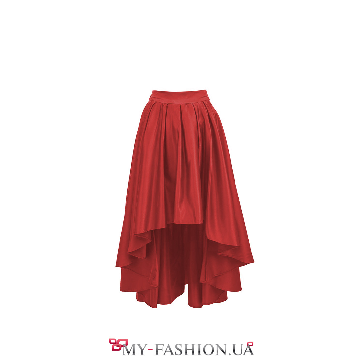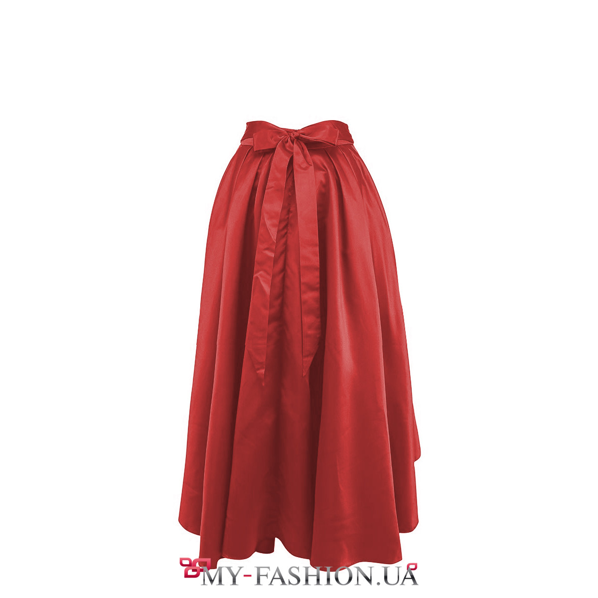 Восхитительная юбка с асимметричным нижним срезом. Сзади изделие максимальной длины, спереди - до колен. Крупные частые складки, закреплённые в поясе, придают юбке непревзойдённый объём, а подвижный пояс, зафиксированный в боковых швах, станет дополнительным украшением. Вы можете перемещать завязку на бока или спинку по вашему усмотрению. Очень удобна в ношении. Материал: атлас-хлопок. Можно изготовить на заказ в любом необходимом размере.
