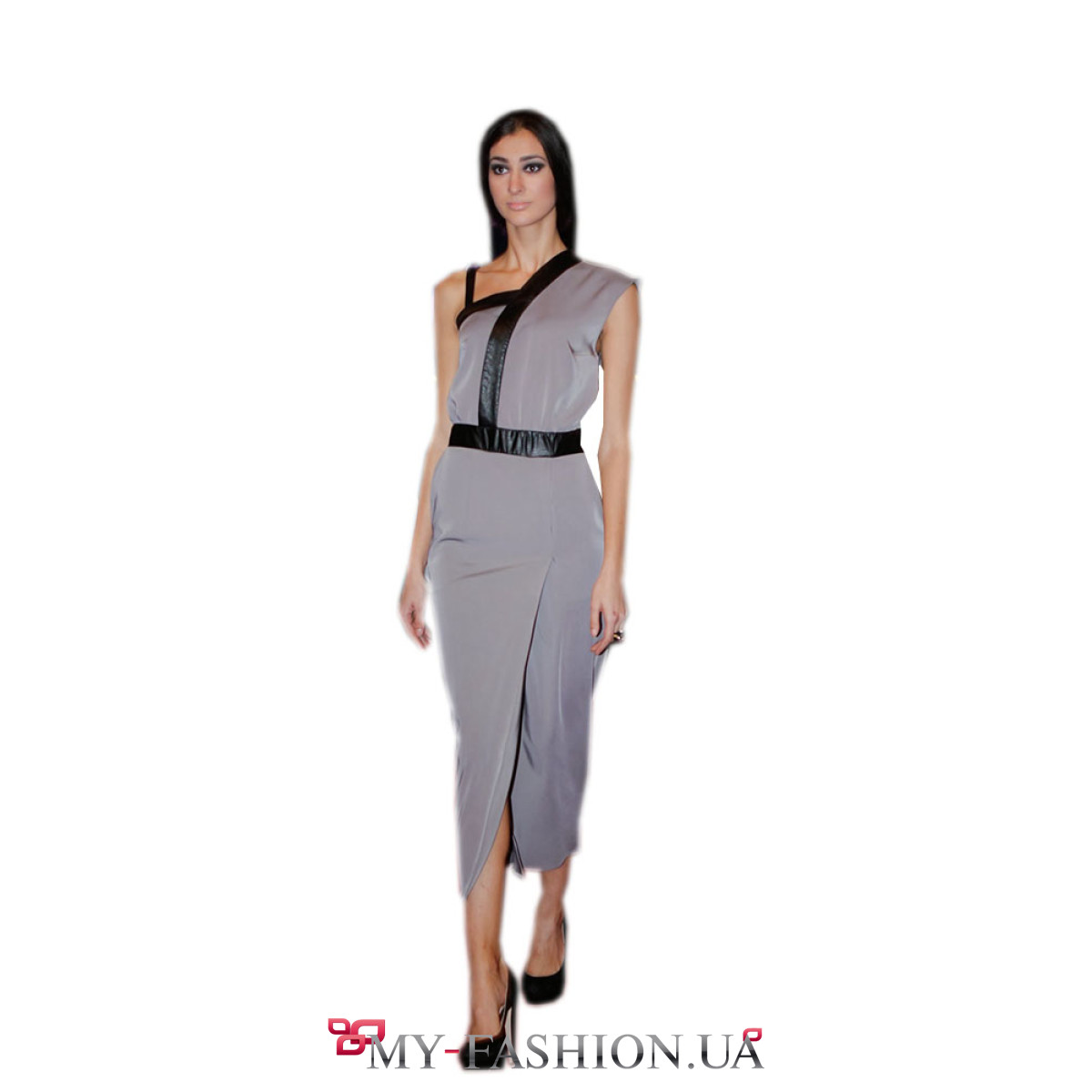 Дизайнерское платье средней длины с асимметричной полочкой и высоким разрезом по бедру. Модель приталенного кроя с чётко выделенной линией талии. Изделие выполнено из тонкой вискозы, очень приятной к телу. Мягкий серый цвет подойдёт девушкам с любым оттенком кожи, а контрастные кожаные вставки правильно расставят акценты. Такая материя делает вещь идеальной для ношения в жаркую погоду. Материалы: вискоза, кожа. Наличие размеров уточняйте. Можно изготовить на заказ в любом необходимом размере.
