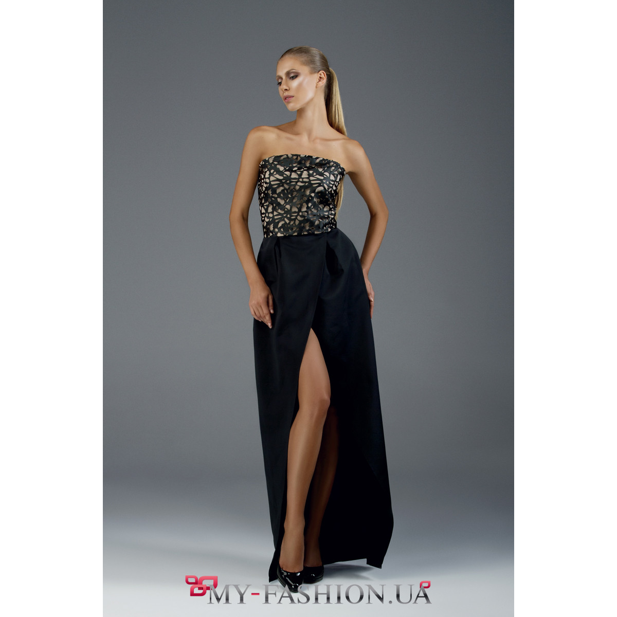 Красивое дизайнерское платье выглядит оригинально и неповторимо. Изделие изготовлено из струящейся ткани, очень приятной к телу. Длинная юбка не сковывает движений и создаёт красивые волны при ходьбе. Полочка хорошо посажена по фигуре и декорирована ажурной перфорированной экокожей на светлой подкладке. Изделие без рукавов и бретелей, длинная юбка на запах интригующе открывает ножку. Материал: креп, атлас-коттон, перфорированная экокожа. Доступные размеры: S, M. Возможен индивидуальный пошив.