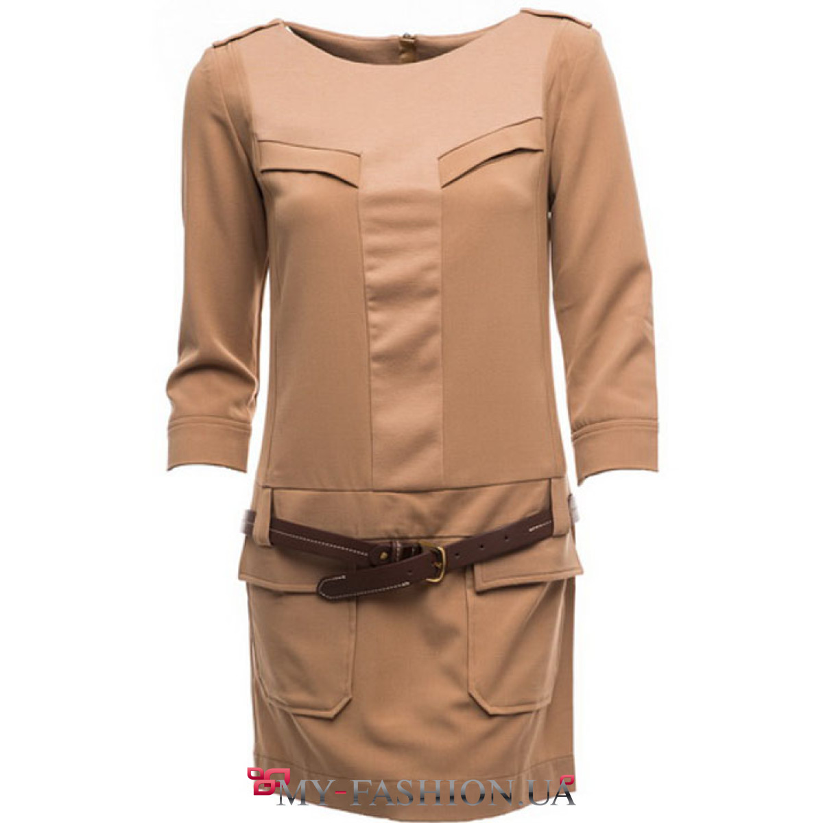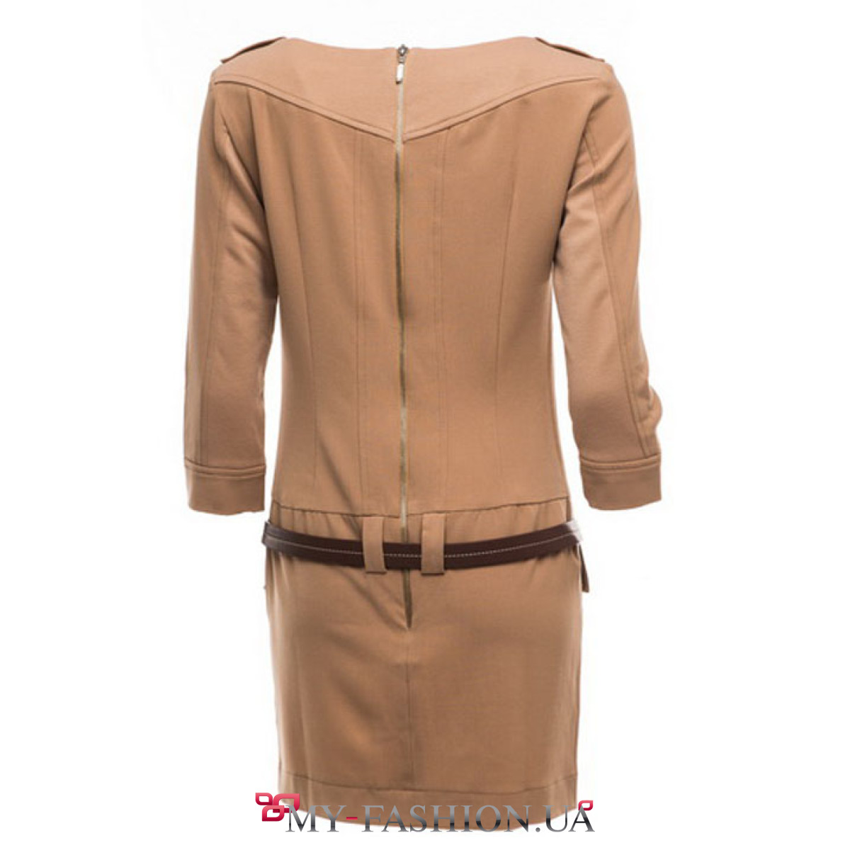 Модное бежевое платье для офиса с опущенной линией талии, обтянутой пояском. Платье восхитительного кроя, облегающего силуэта, декорировано рельефными швами, которые дизайнер спрятал в отрезную кокетку. Наличие карманов на линии груди и юбке делают силуэт более разнообразным. Спинка платья украшена не только металлической молнией, но и острой кокеткой. Низ и рукава отделаны каймой. Состав: 55% - вискоза, 40% - полиэстер, 5% - эластан. Наличие размеров уточняйте. Можно изготовить на заказ в любом необходимом размере.
