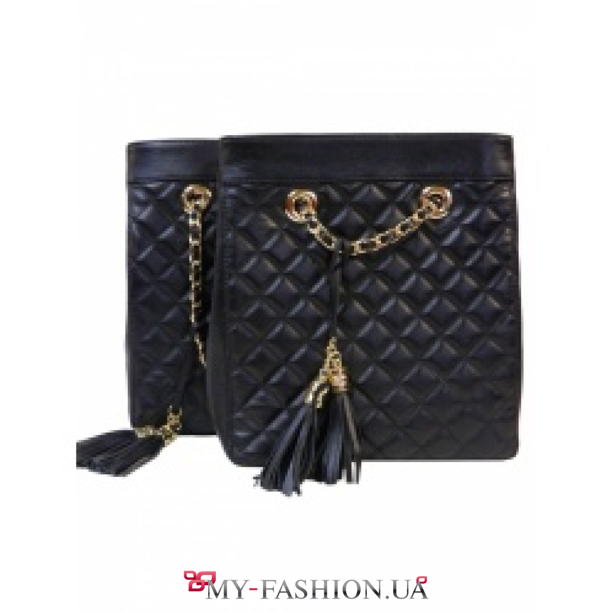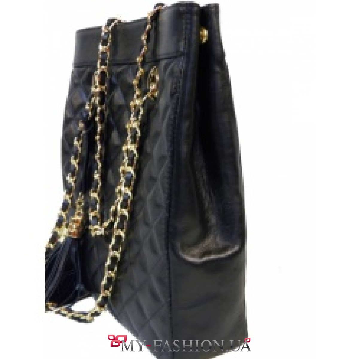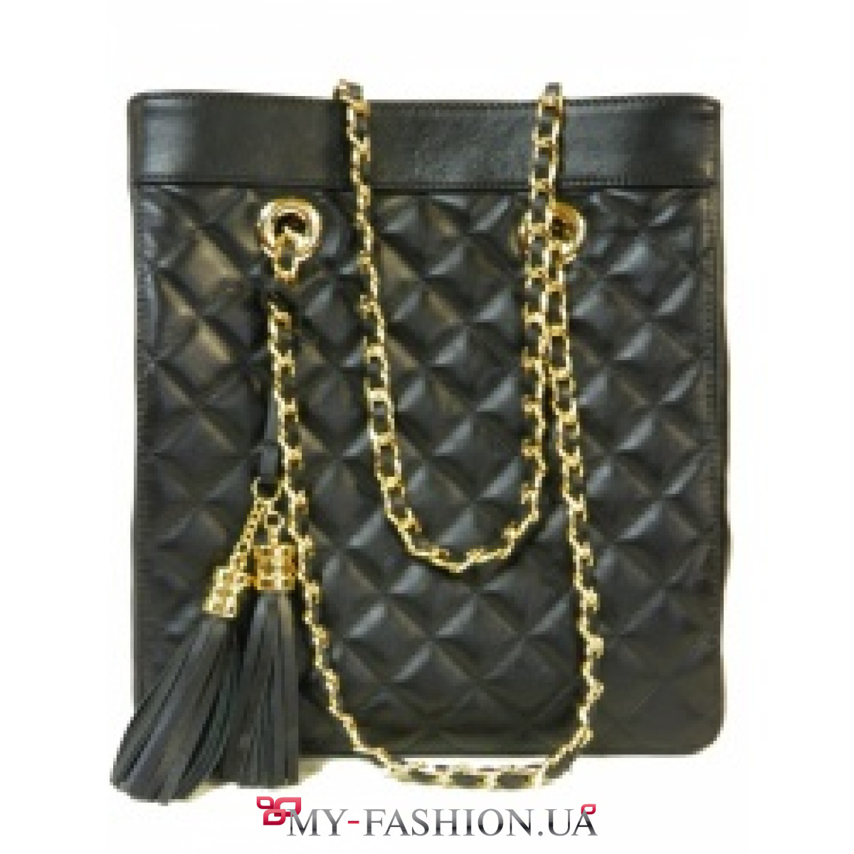 Качественная сумка из натуральной стёганой кожи классического чёрного цвета. Изделие декорировано крупными кожаными кисточками в тон и привлекательной золотистой фурнитурой. Внутри одно вместительное отделение и карман на молнии. Ручки-цепочки подходят для ношения как в ладонях, так и на плече. Кнопки по бокам позволяют регулировать объём и форму модели. Материал: высококачественная натуральная кожа. Изделие ручной работы. Подберите к сумке привлекательное модное платье.
