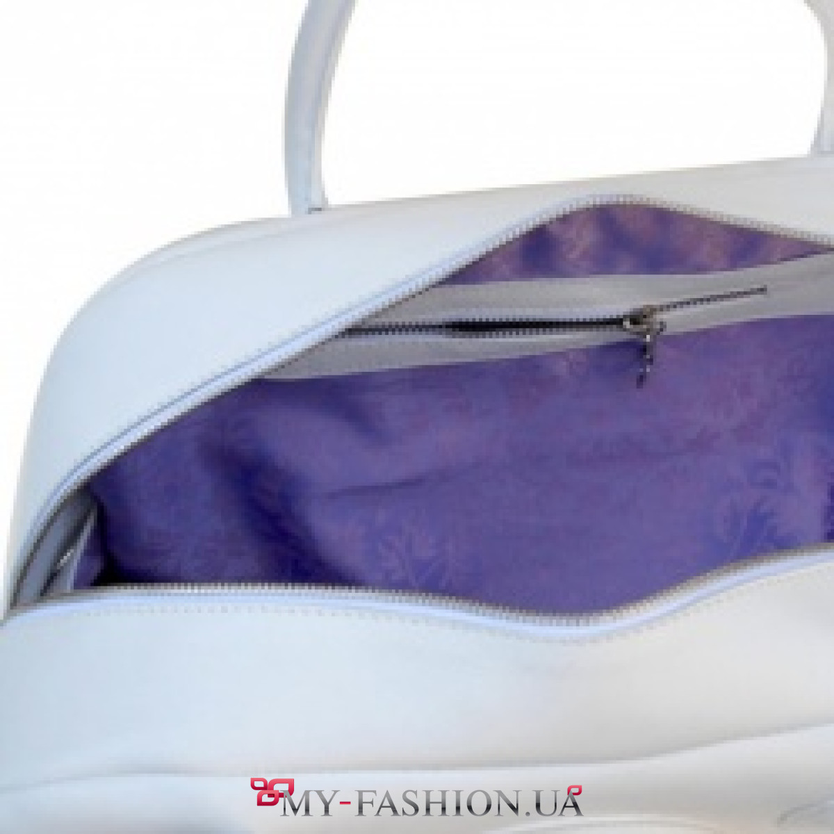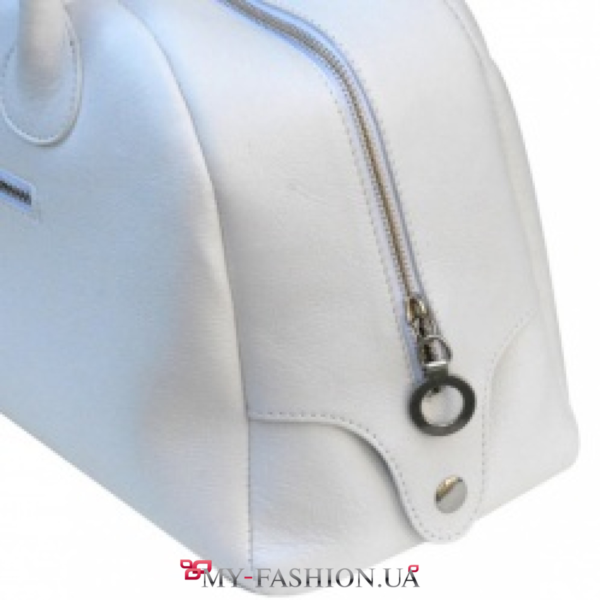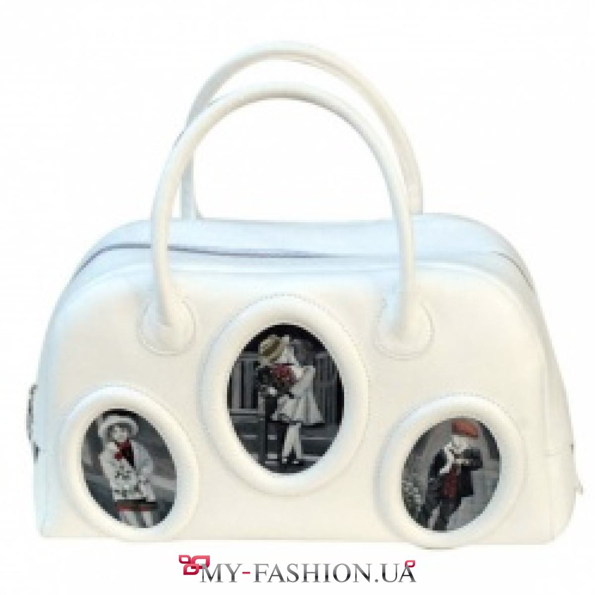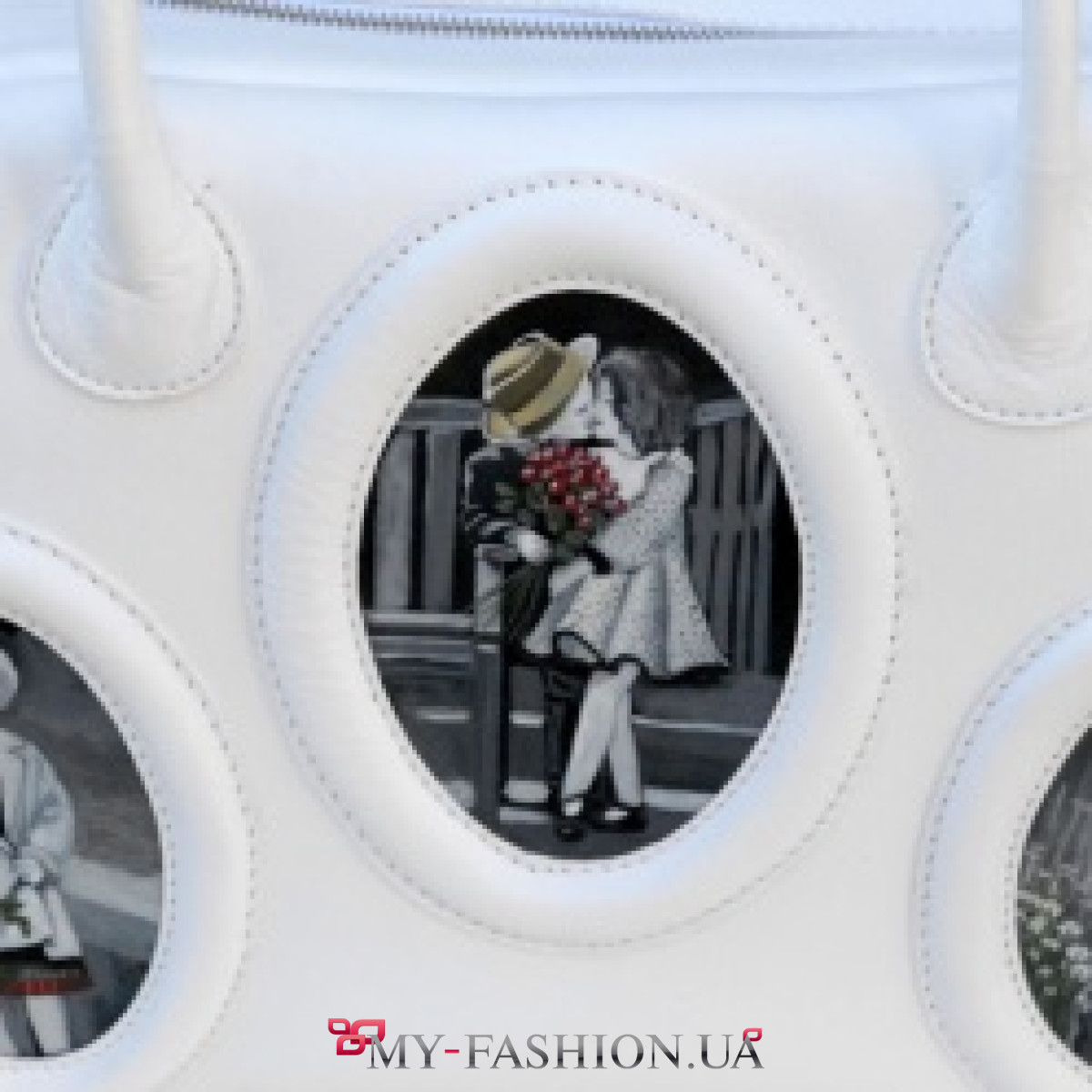 Красивый и вместительный белый дорожный саквояж в стиле ретро. Внутри одно отделение и карман, задняя стенка оснащена карманом на молнии. Передняя стенка декорирована оригинальными рисунками ручной работы, выполненными специальными красками. Дно укреплено металлическими ножками, которые позволяют без опасений ставить сумку на любую поверхность. Незаменимая вещь в поездках налегке. Материал: высококачественная натуральная плотная кожа. Изделие ручной работы.