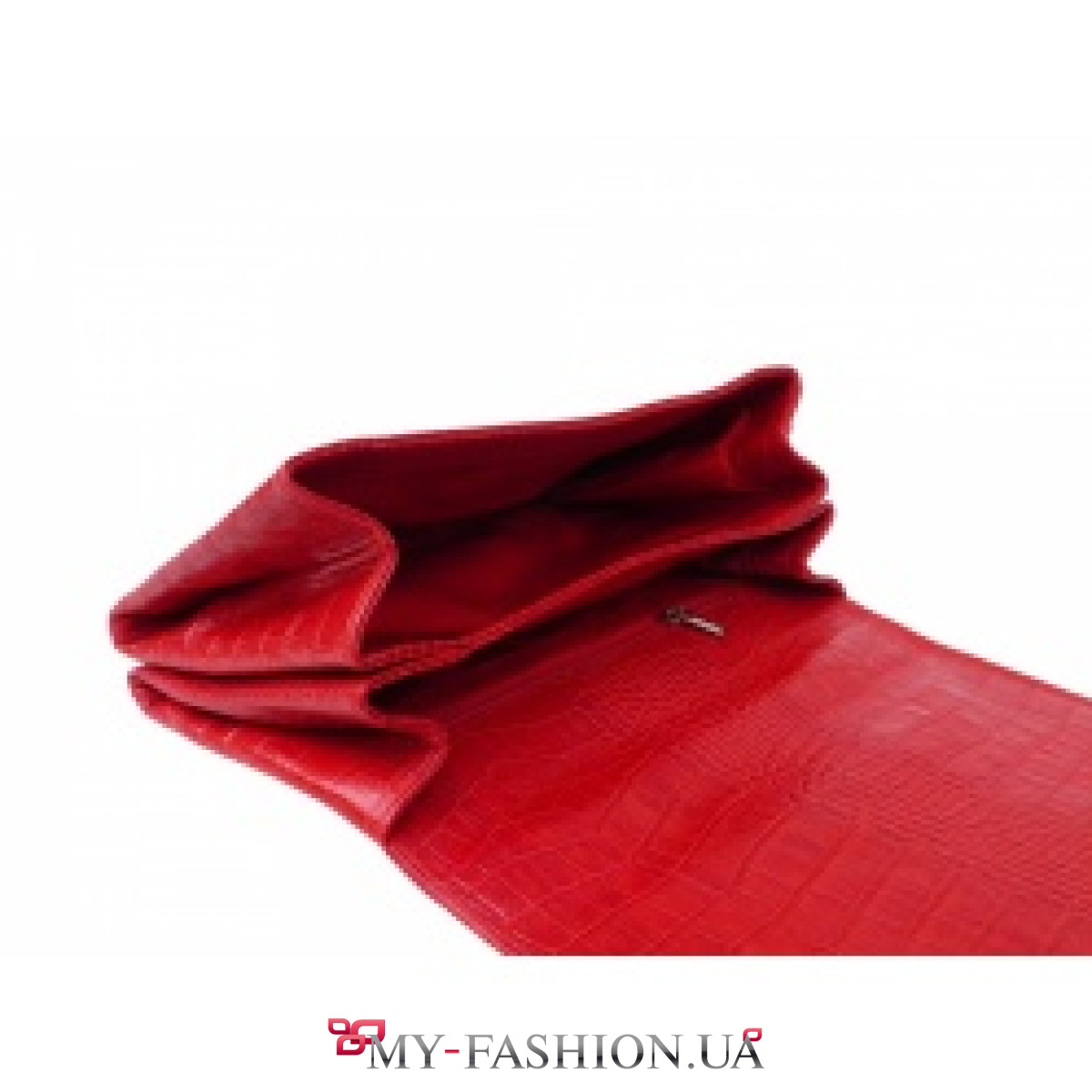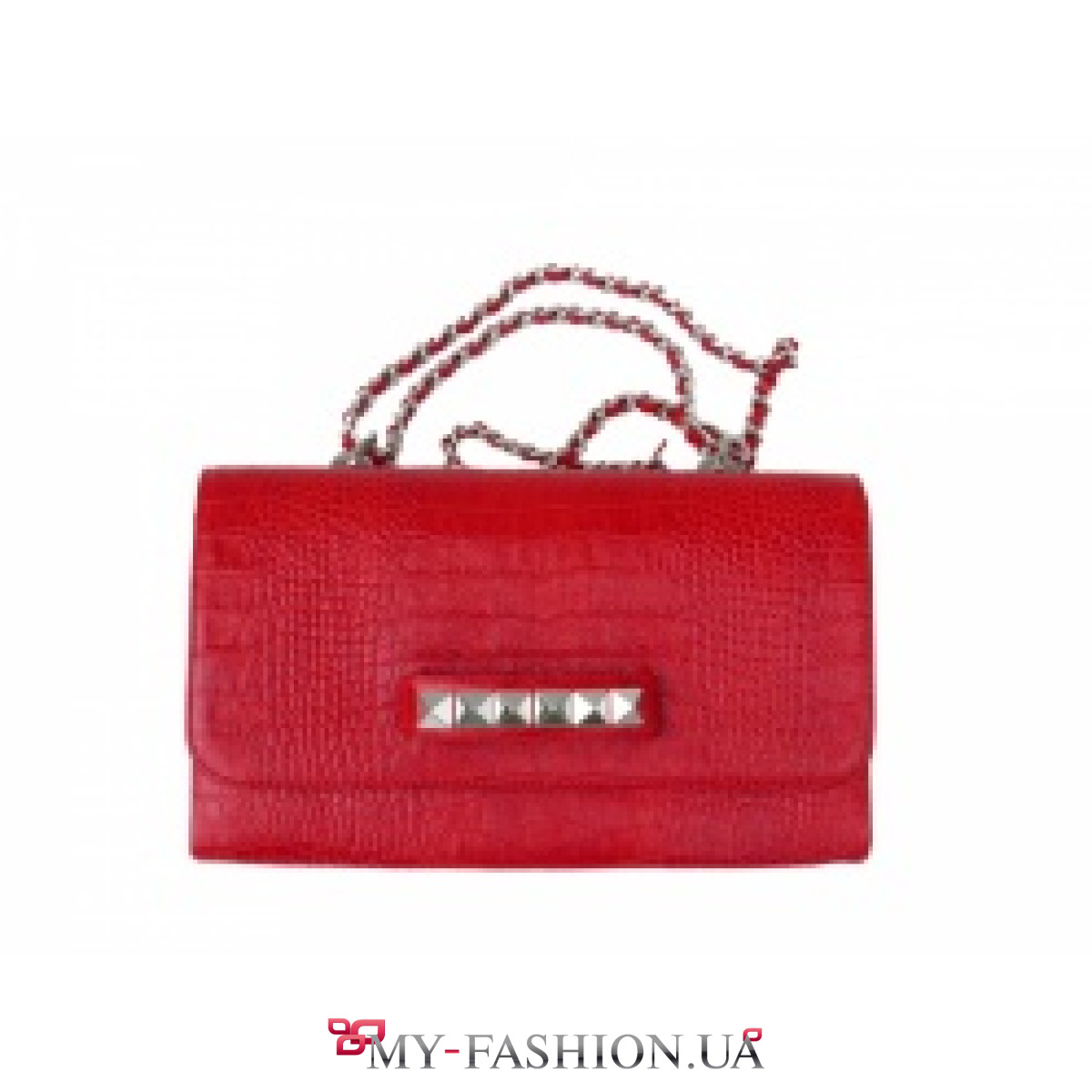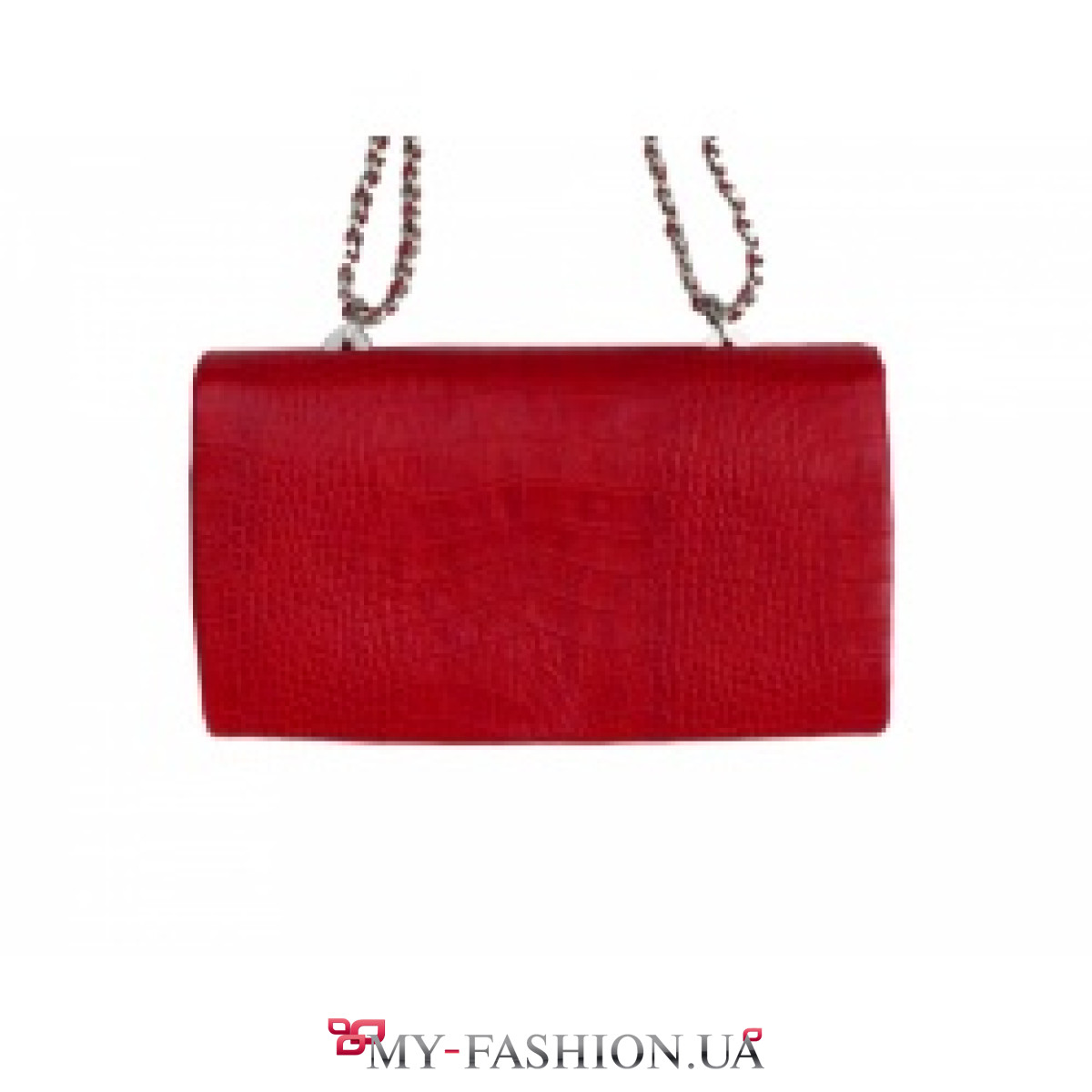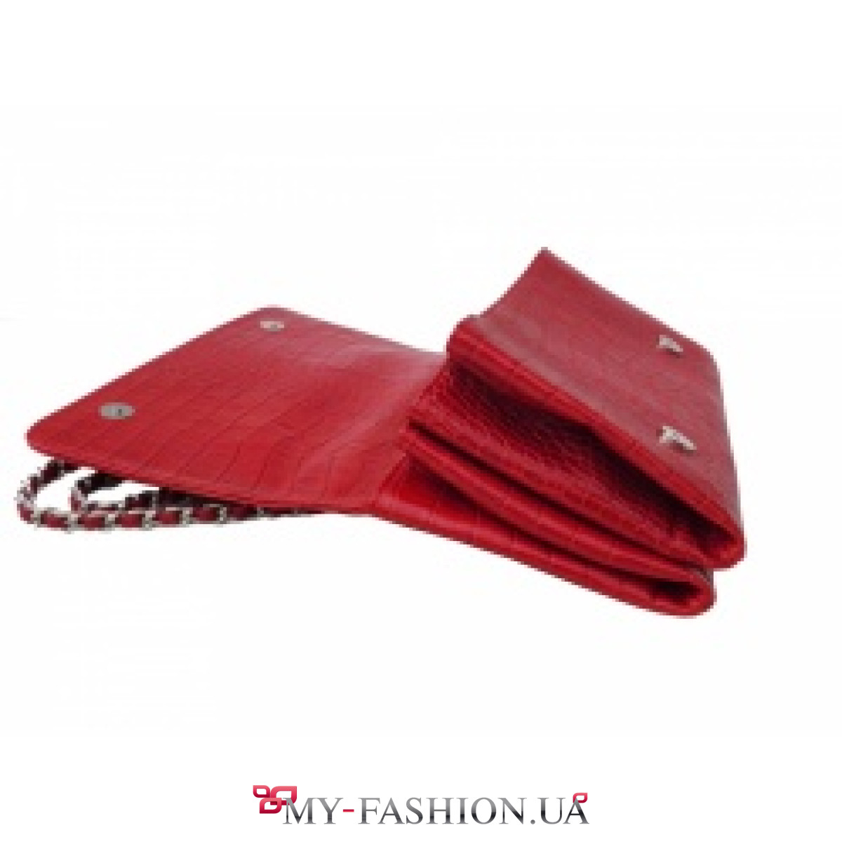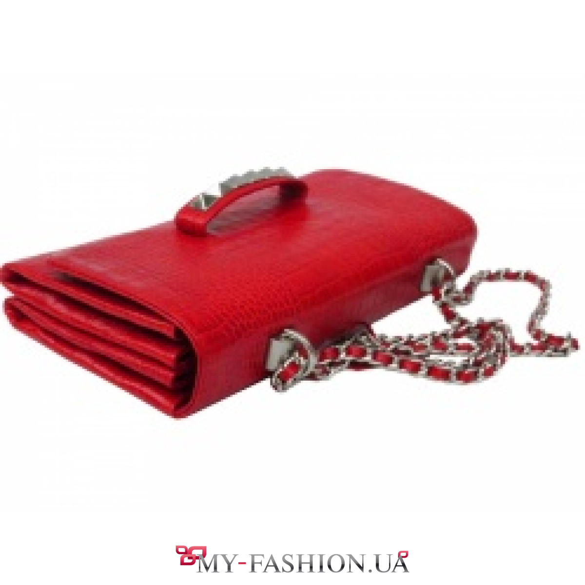 Привлекательный ярко-красный клатч с цепочкой и ремешком для ладони. Внутри два отделения и практичный карман на молнии. Закрывается на две внутренние магнитные кнопки. Изделие имеет длинную цепочку, позволяющую носить клатч на плече. Небольшой ремешок для ладони украшен стильными металлическими заклёпками серебристого цвета. Тиснение под кожу крокодила является дополнительным декоративным элементом. Материал: высококачественная натуральная кожа. Изделие ручной работы.