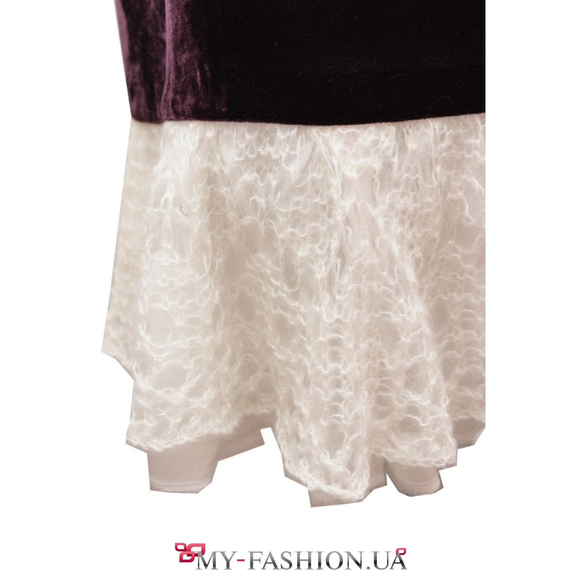 Модное платье прямого силуэта с короткими рукавами и застежкой- завязка. В наличии этого роскошного изделия не имеется, но мы можем выполнить его в индивидуальном порядке с предоплатой. Платье из натурального бархата чернильного цвета с декорировано белым кружевом и широкой оборкой по низу изделия. Основа платья натуральный бархат, отделка платья шелковое кружево.