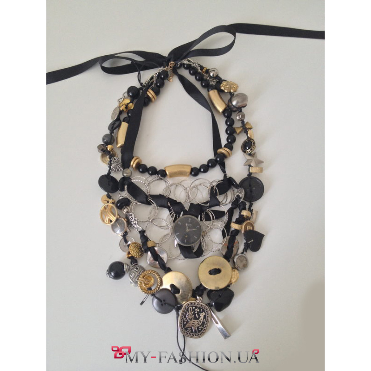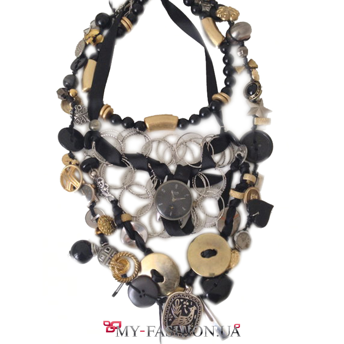 Шикарное авторское колье. Качественные материалы и идеальный размер обеспечивают длительное и комфортное ношение. Этот аксессуар прекрасно дополнит как ваш любимый повседневный наряд, так и изысканное вечернее платье. Ожерелье можно изготовить в любом необходимом цвете по указанным вами параметрам. Также вы можете предоставить собственный аксессуар для вплетения его в ансамбль. Срок изготовления: 7-10 рабочих дней. Материалы: винтажные пуговицы, подвески, камни, текстиль. Полностью ручная работа.