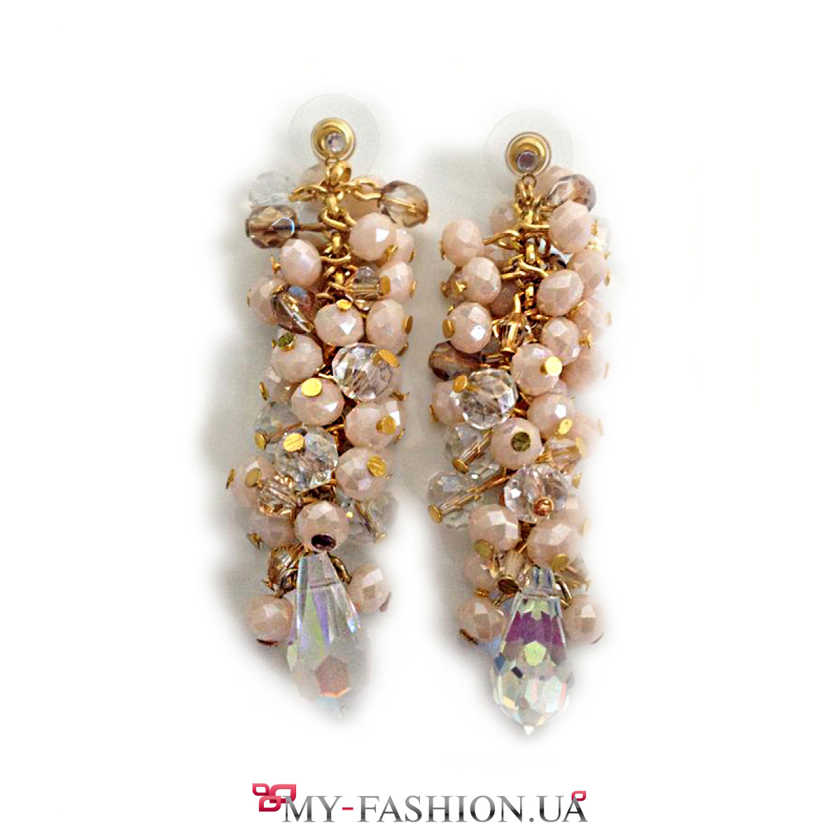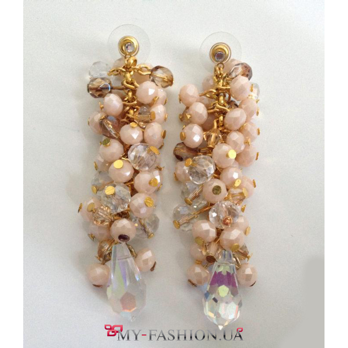 Восхитительные крупные серёжки - прекрасный аксессуар, который идеально дополнит и коктейльное, и длинное вечернее платье. Такое украшение станет замечательным подарком для каждой девушки, ведь при выборе серёжек невозможно прогадать с размером или посадкой по фигуре. При индивидуальном заказе вы можете обсудить с дизайнером желаемый цвет серёжек и даже немного их видоизменить по собственному вкусу. Материалы: чешское стекло, стразы, бисер. Полностью ручная работа.