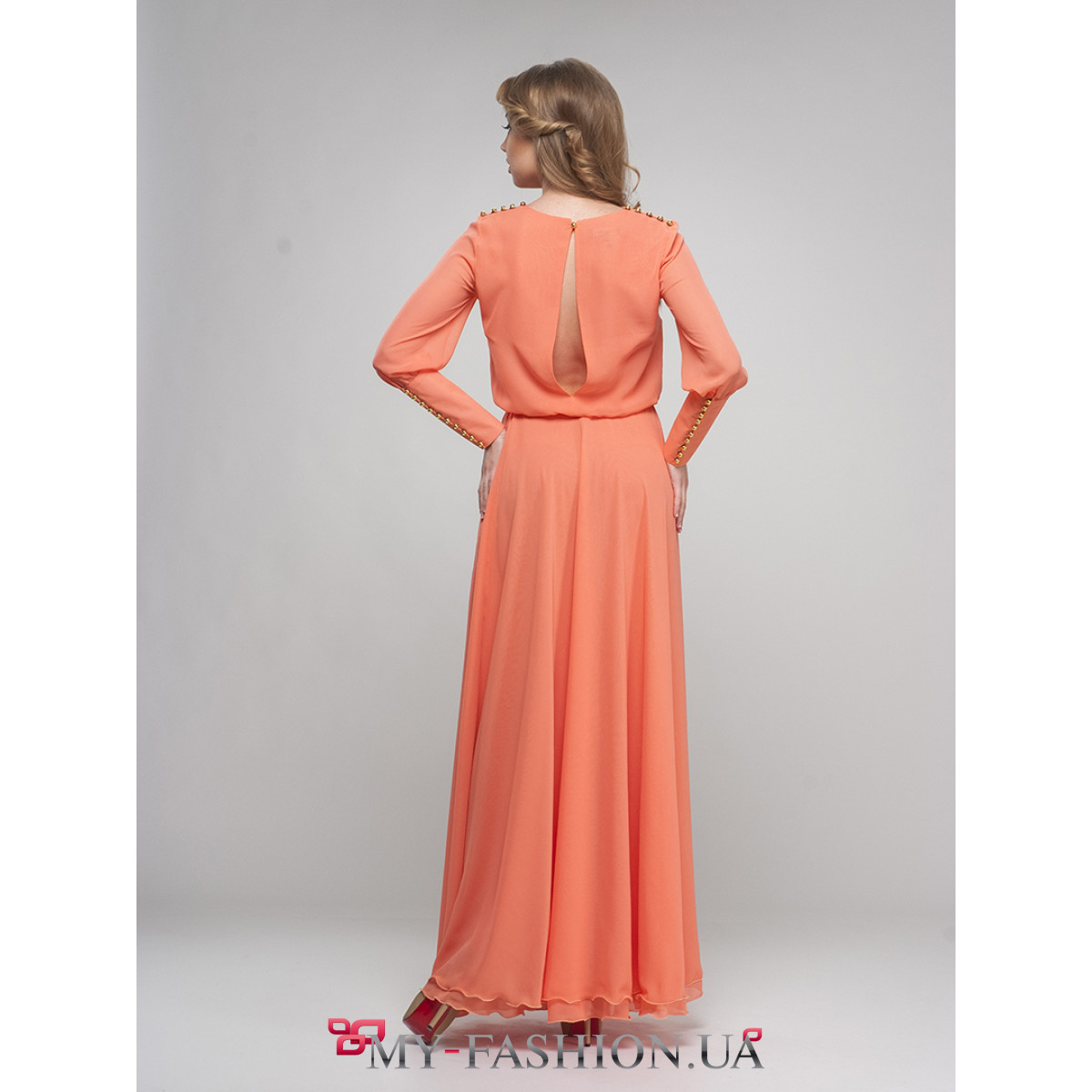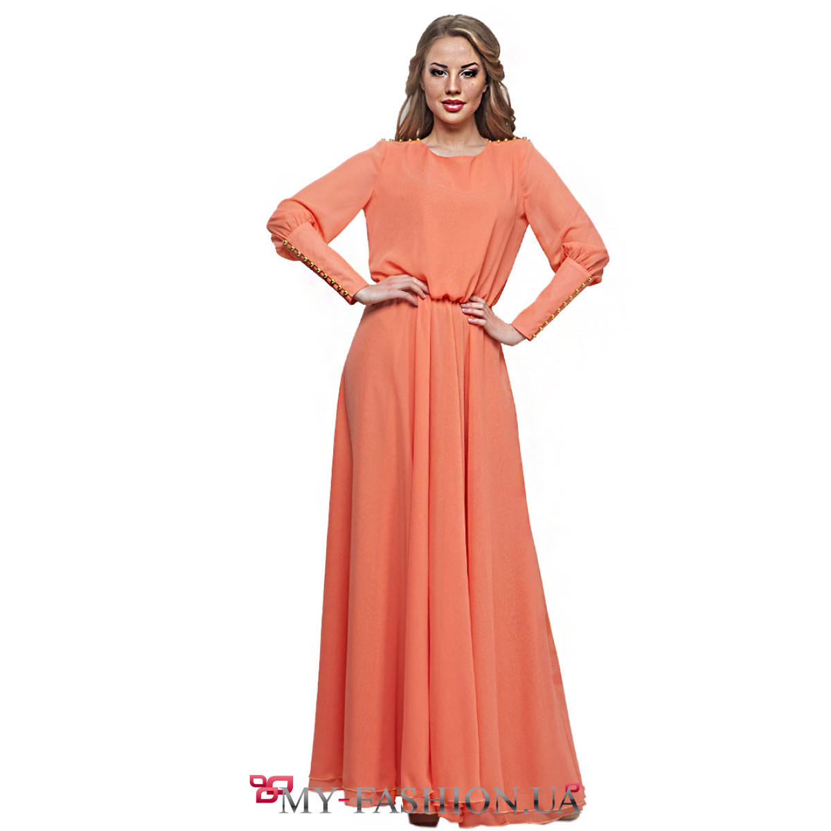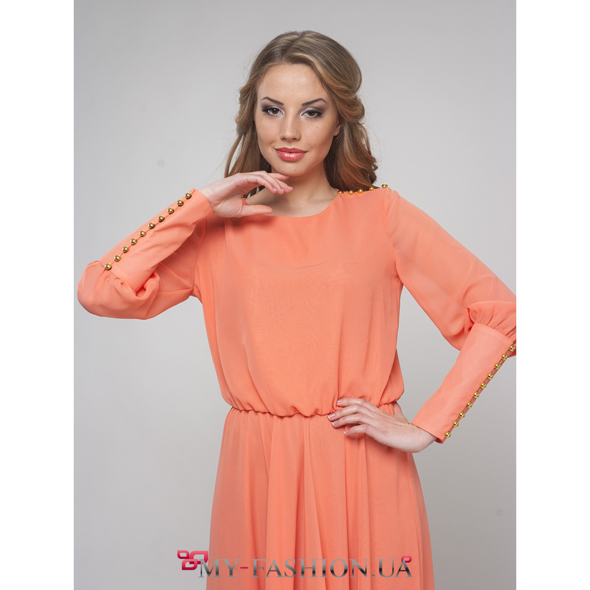 Восхитительное длинное шифоновое платье персикового цвета с мелкими пуговицами на рукавах. На пошив уходит 6,5 метров ткани. Длина изделия - 160 см, длина рукава - 53 см. Эта модель - прекрасный вариант для выпускного вечера или другого торжественного мероприятия. Платье смотрится стильно, изысканно и дорого, оно способно ненавязчиво выделить вас среди окружающих. Для дополнения образа отлично подойдут авторские аксессуары и изысканный клатч. Наличие размеров уточняйте. Можно изготовить на заказ в любом необходимом размере.