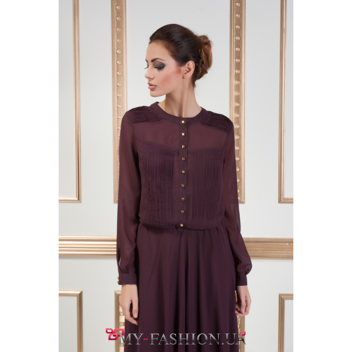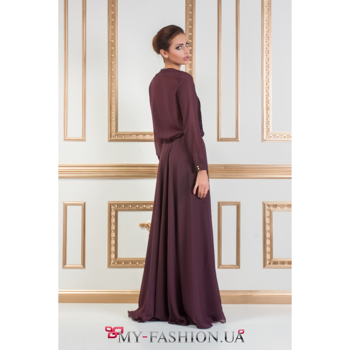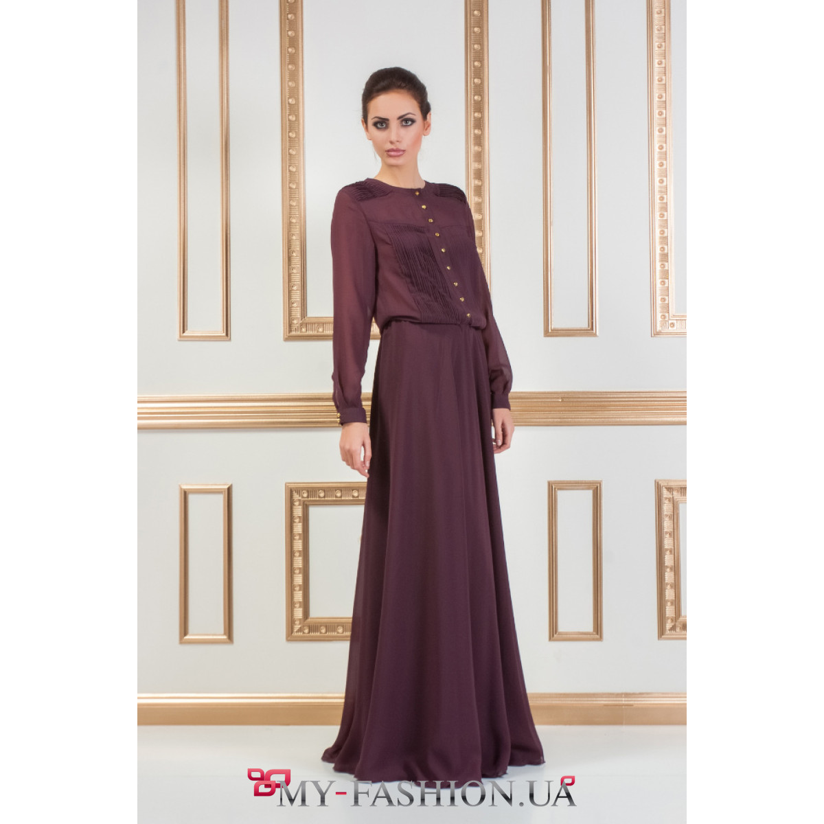Роскошное платье максимальной длины отлично подходит для празднования свадьбы в качестве гостя. Изделие свободного кроя с посадкой на талии, длинный рукав собран в аккуратный манжет. Полочку и плечи изделия украшают оригинальные мелкие защипы, золотистые пуговицы спереди являются дополнительным элементом декора. Юбка на подкладке. Состав: 30% - вискоза, 70% - полиэстер. Размер одежды на модели: S. Можно изготовить на заказ в любом необходимом размере.