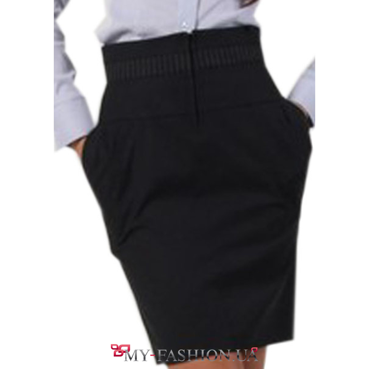 Черная корсетная юбка на молнии с высокой посадкой. Модная черная юбка средней длины, спереди на молнии, юбка имеет также 2 накладных кармана, а сзади разрез. Длина изделия - 55 см. Размеры от 42 по 54. Просмотрите и наш каталог ярких кожаных сумочек. Цвет - темно-серый или черный. Состав - 50% шерсть, 50% акрил.
