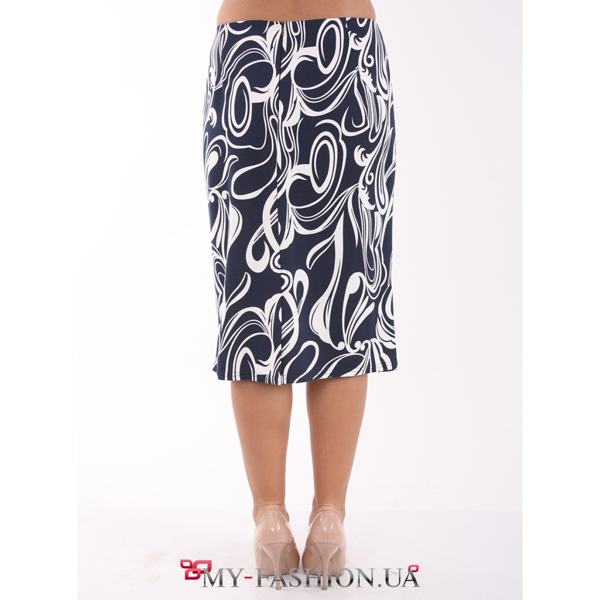 Красивая чёрно-белая юбка, изготовленная из натурального хлопка. Изделие носится на талии, полностью закрывает коленную чашечку. Юбка классического ровного кроя, что делает её универсальной и подходящей для любых жизненных ситуаций: работы, прогулок, встреч, праздников. Белый абстрактный рисунок на чёрном фоне делает наряд особенным. Прекрасно сочетается с однотонными майками, футболками, блузами, кофтами, пиджаками. Можно носить с обувью как на каблуках, так и на низком ходу.