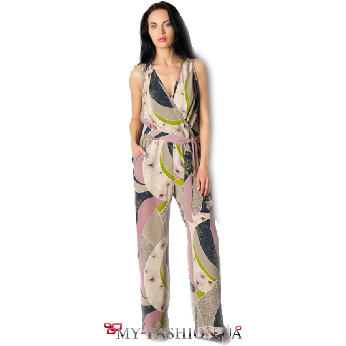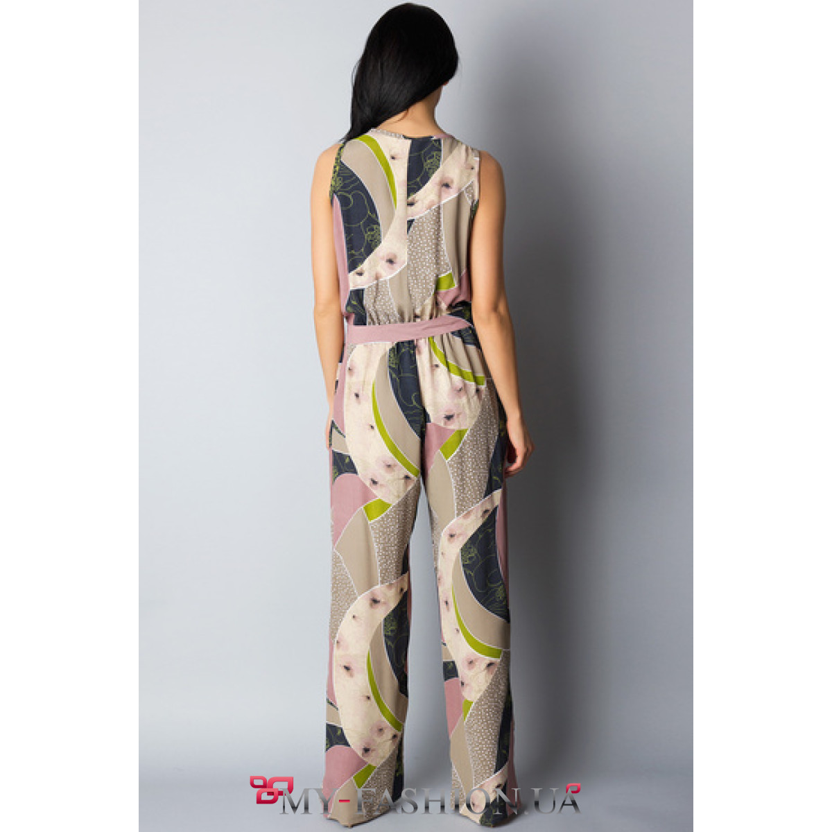 Очень удобный комбинезон без рукавов с красочным принтом. Благодаря свободному крою, отлично скрывает недостатки фигуры и хорошо смотрится в любом размере. Изделие выполнено из натуральной ткани, которая не нагревается до температуры 40 градусов, что делает его просто незаменимым в летнюю жару. Верх комбинезона запахивается, талия подвязывается тонким поясом. Доступен в разных размерах: как в маленьких, так и в больших.