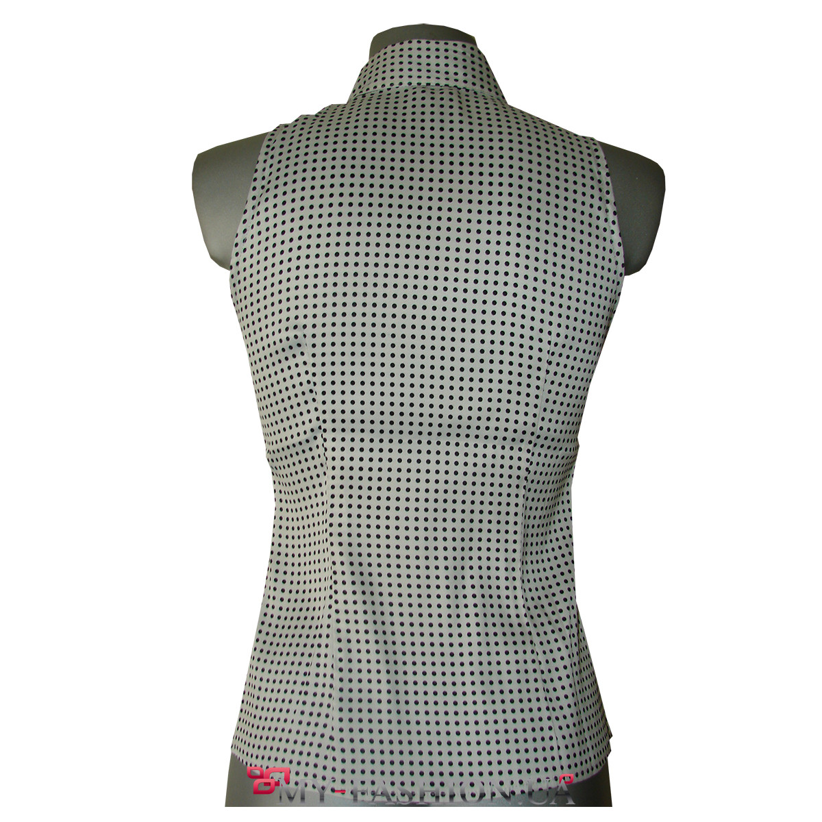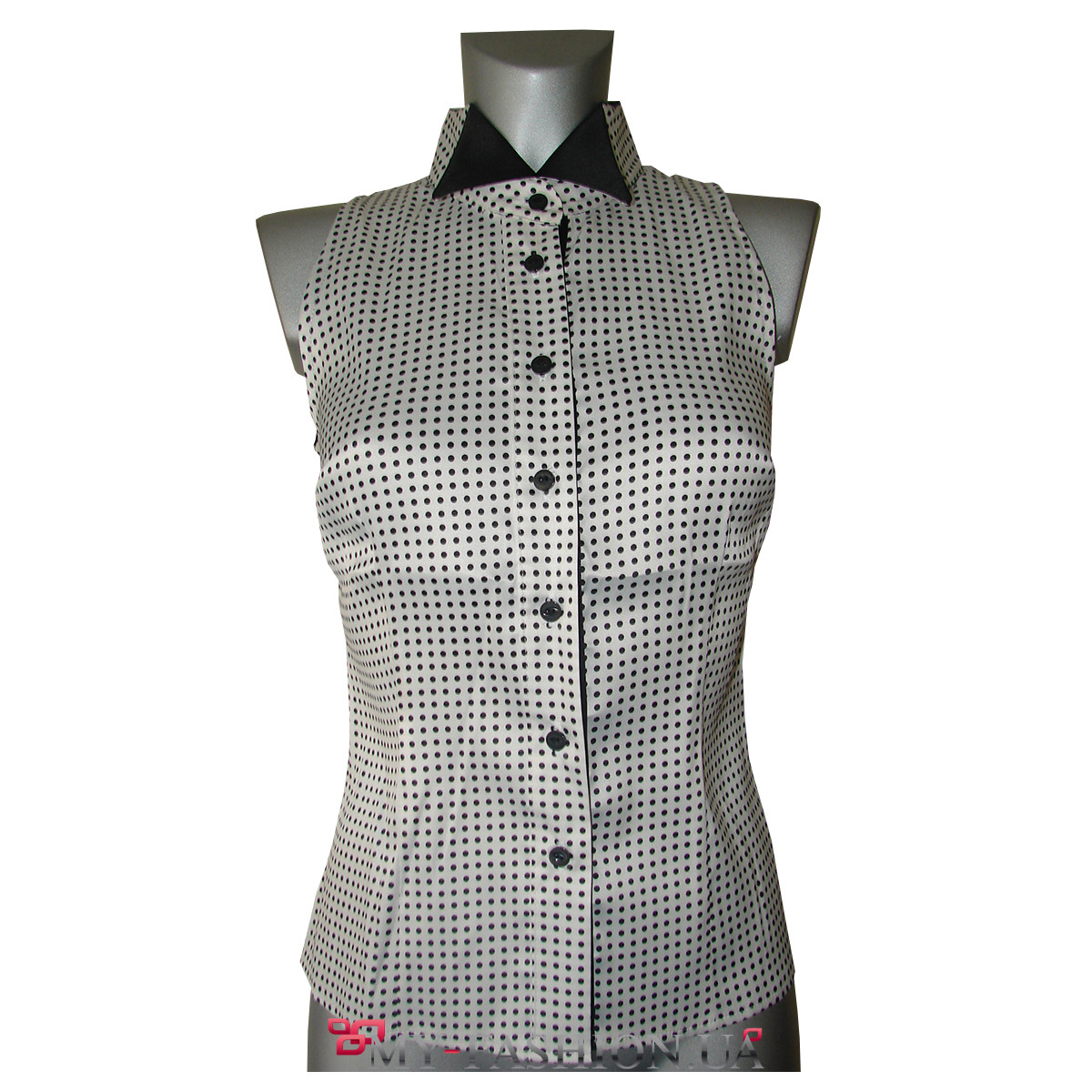 Летняя блузка приталенного силуэта из натуральной хлопковой ткани. Изделие без рукавов, застёгивается спереди на маленькие чёрные пуговицы. Оригинальный высокий воротник-стойка с чёрным отворотом является прекрасным элементом декора и изюминкой изделия. Рельефные швы обеспечивают максимальную посадку по фигуре. Хорошо сочетается как с брюками, так и с юбками, будет органично выглядеть в рабочей обстановке. Состав: 95% - хлопок, 5 % - спандекс.В наличии размеры 44, 46, 48, 50.