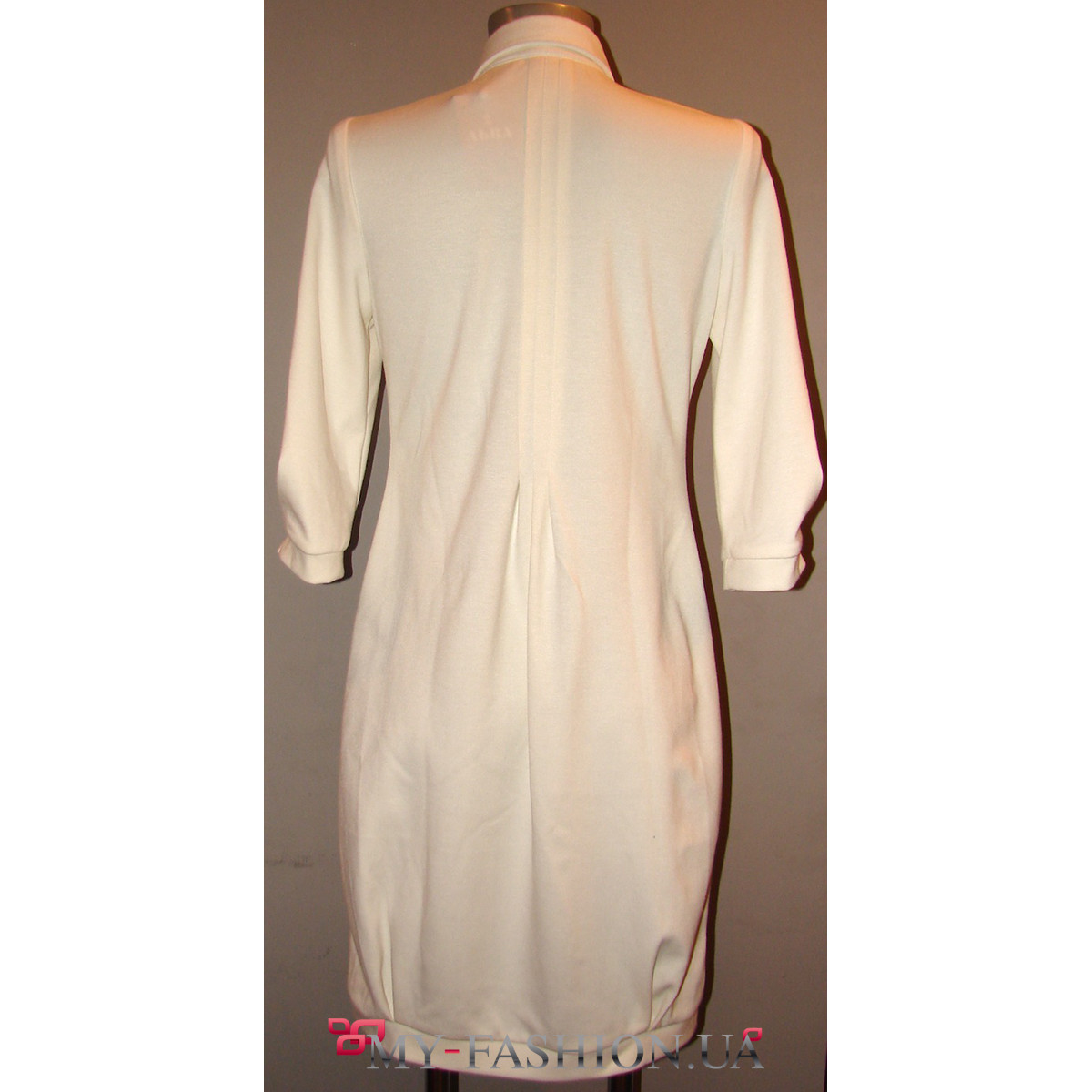 Простое и красивое платье-туника из тёплой трикотажной материи будет уместным на многих мероприятиях. Изделие свободного кроя, длиной достигает колен. Рукава три четверти собраны в аккуратные манжеты, которые отлично сочетаются с классическим воротником-поло. Рельефные симметричные швы на полочке значительно смягчают силуэт. Платье можно носить и как самостоятельный наряд, и под узкие брюки или лосины. Материал: тёплый хлопковый трикотаж. В наличии размеры 42, 44, 46, 48.