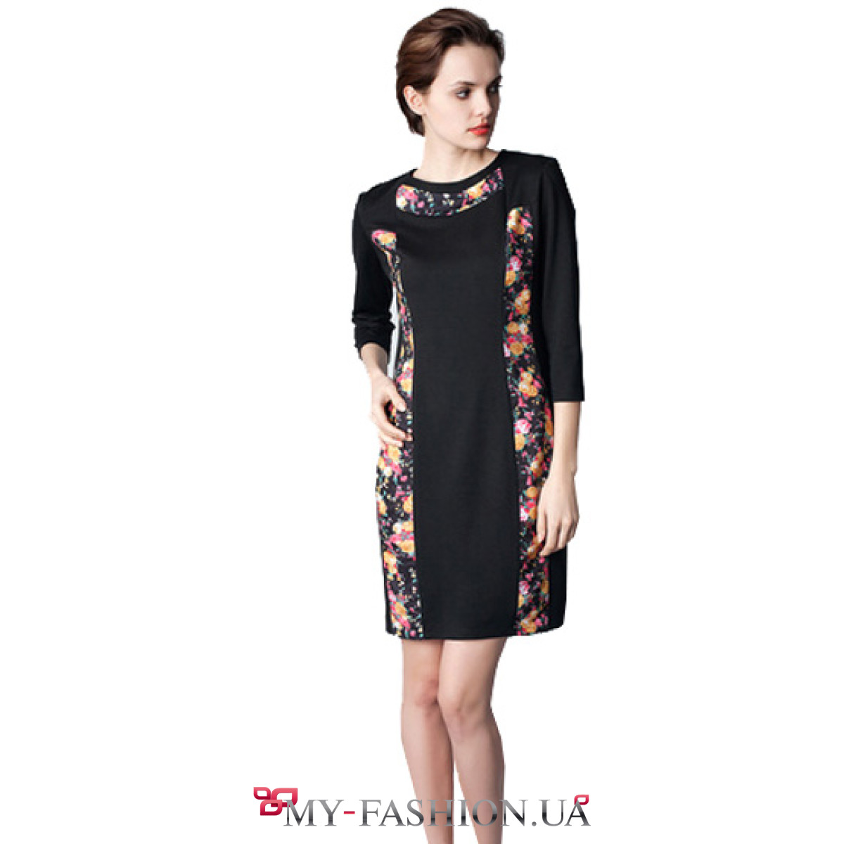Красивое чёрное платье будет органично смотреться на любом мероприятии и хорошо подходит для повседневного ношения. Рукав три четверти отлично гармонирует с неглубокой полукруглой горловиной, разрез сзади обеспечивает свободу движений. Изделие украшено яркими широкими вставками из цветочной ткани. Застёгивается на потайную молнию в боковом шве. Материал: плотный трикотаж. В наличии размер 46. Можно изготовить на заказ в любом необходимом размере.