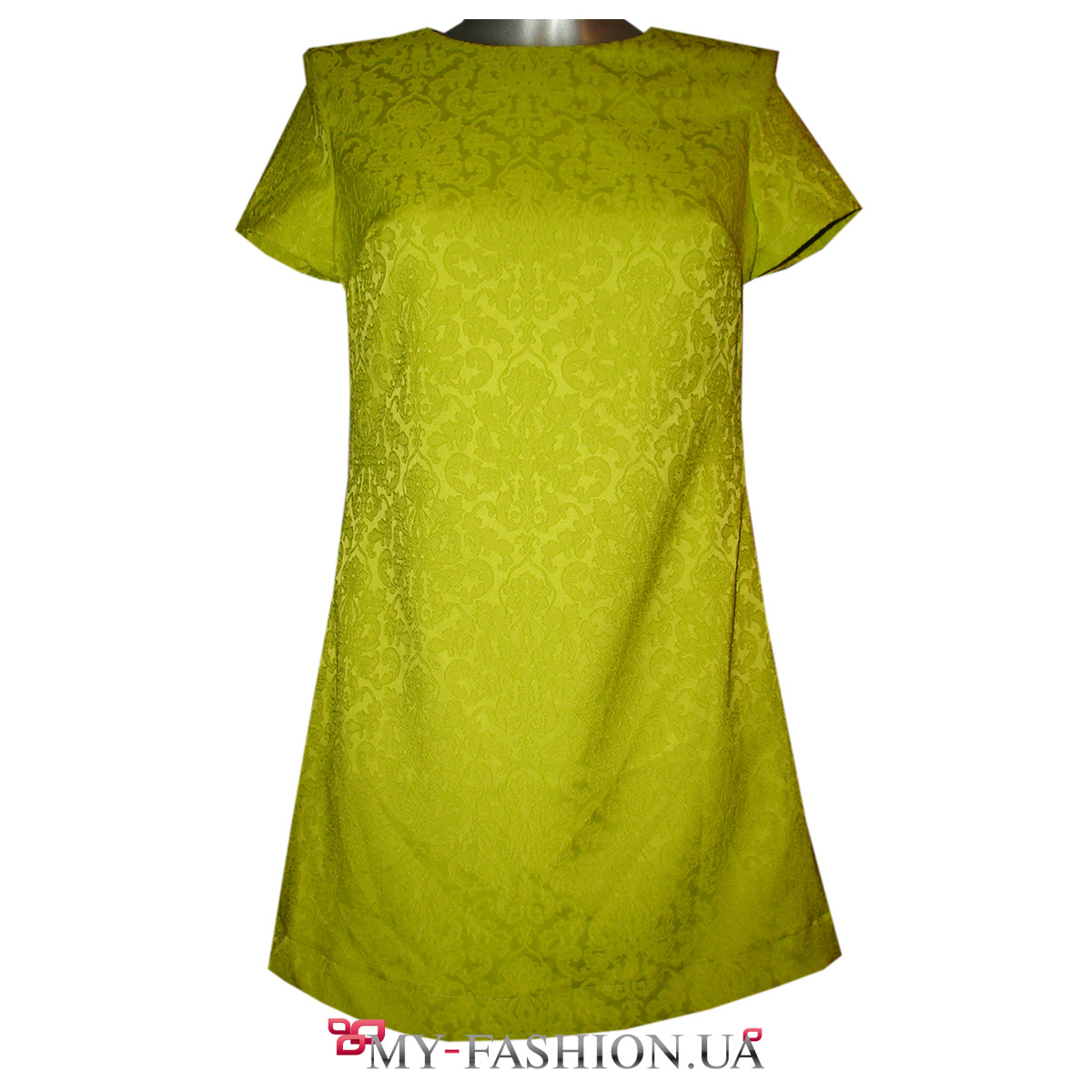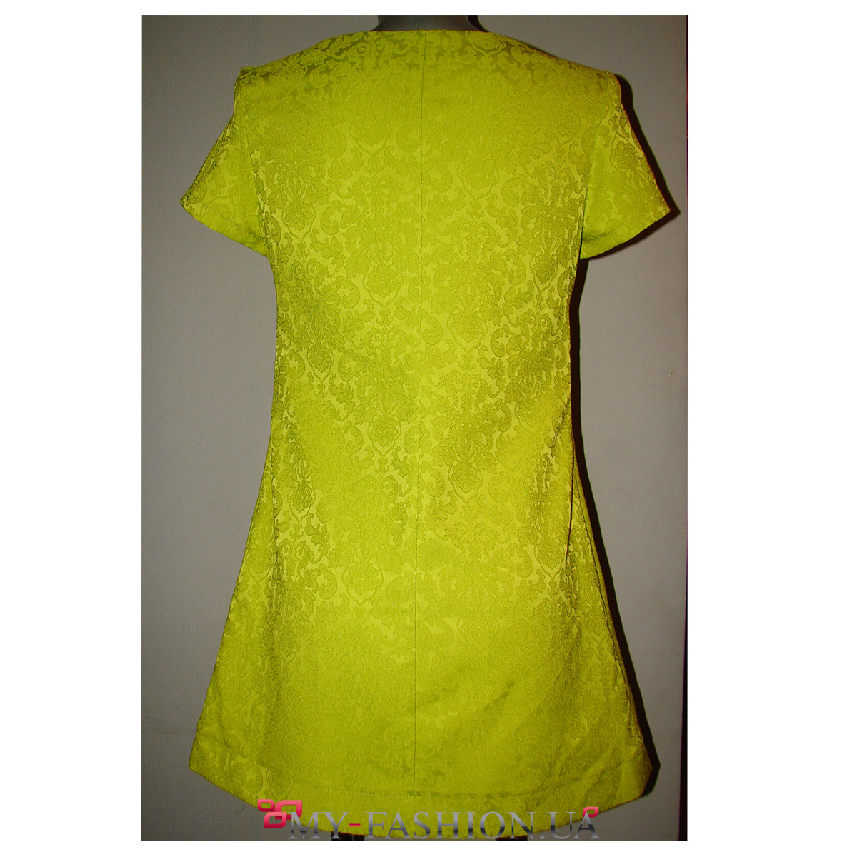 Удобное платье свободного силуэта с короткими рукавами. Горловина круглая, застёжка расположена на спинке. Представленная модель отлично выглядит в комплекте с узкими брюками. Изделие выполнено из высококачественного французского жакарда на натуральной основе ярко-жёлтого цвета. Витиеватый орнамент в тон отлично разбавляет образ и вызывает желание присмотреться получше. Материал: жаккард. Состав: 75% - хлопок, 25% - эластан. Наличие размеров уточняйте. Можно изготовить на заказ в любом необходимом размере.