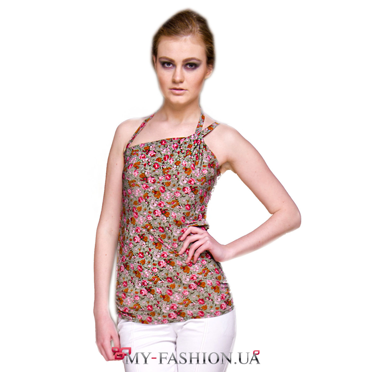 Восхитительный яркий топ строго приталенного кроя - прекрасный выбор для летней погоды. Изделие без рукавов декорировано тонкими бретельками оригинального расположения. Приятный цветочный принт обязательно подарит хорошее настроение. Топ будет изумительно смотреться с узкими белыми джинсами или юбкой любого фасона. Дополняйте наряд авторскими аксессуарами. Материал: трикотаж. Наличие размеров уточняйте. Можно изготовить на заказ в любом необходимом размере.