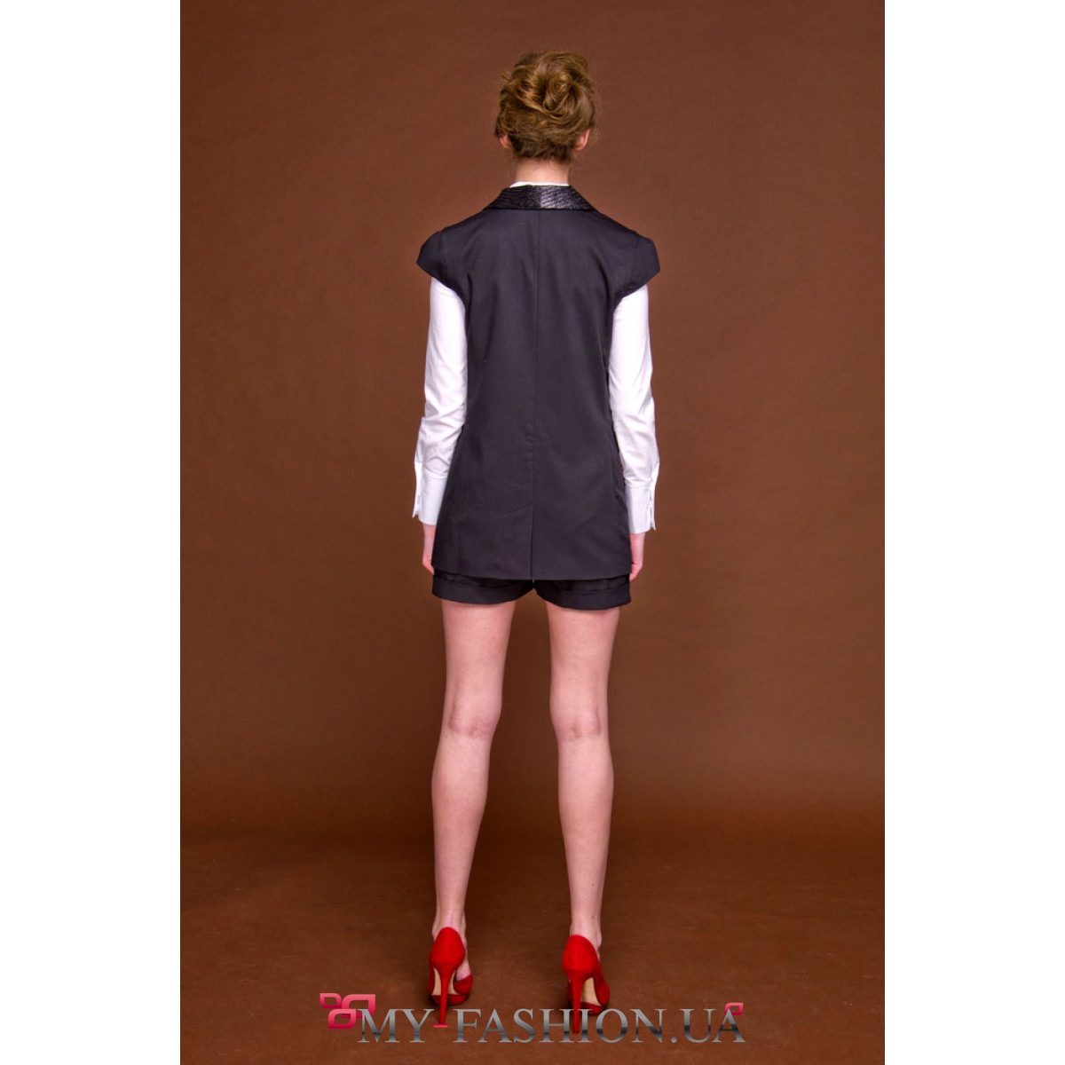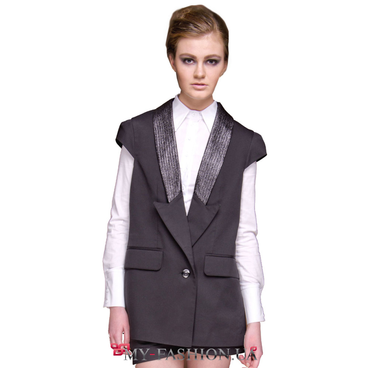 Оригинальный удлинённый пиджак без рукавов с английским воротником и удобными карманами. Классический чёрный цвет делает модель абсолютно универсальной в комбинациях. Сочетайте с блузой и классическими брюками для создания делового образа или с короткими шортами, чтобы подчеркнуть своё чувство стиля. Материал: костюмная ткань. Состав: 20% - вискоза, 75% - полиэстер, 5% - эластан. Наличие размеров уточняйте. Можно изготовить на заказ в любом необходимом размере.