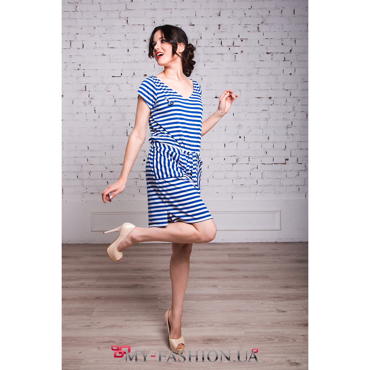 Стильное платье-туника в морскую полоску - оригинальное и комфортное решение для летнего наряда. Изделие без рукавов, с глубоким треугольным вырезом декольте. Это свободное платье имеет лаконичный прямой силуэт и спинку с классическим круглым вырезом. Линия талии занижена и украшена широким поясом-завязкой, пересекающимся с карманами. Материал: трикотаж. Наличие размеров уточняйте. Можно выполнить на заказ в любом необходимом размере.