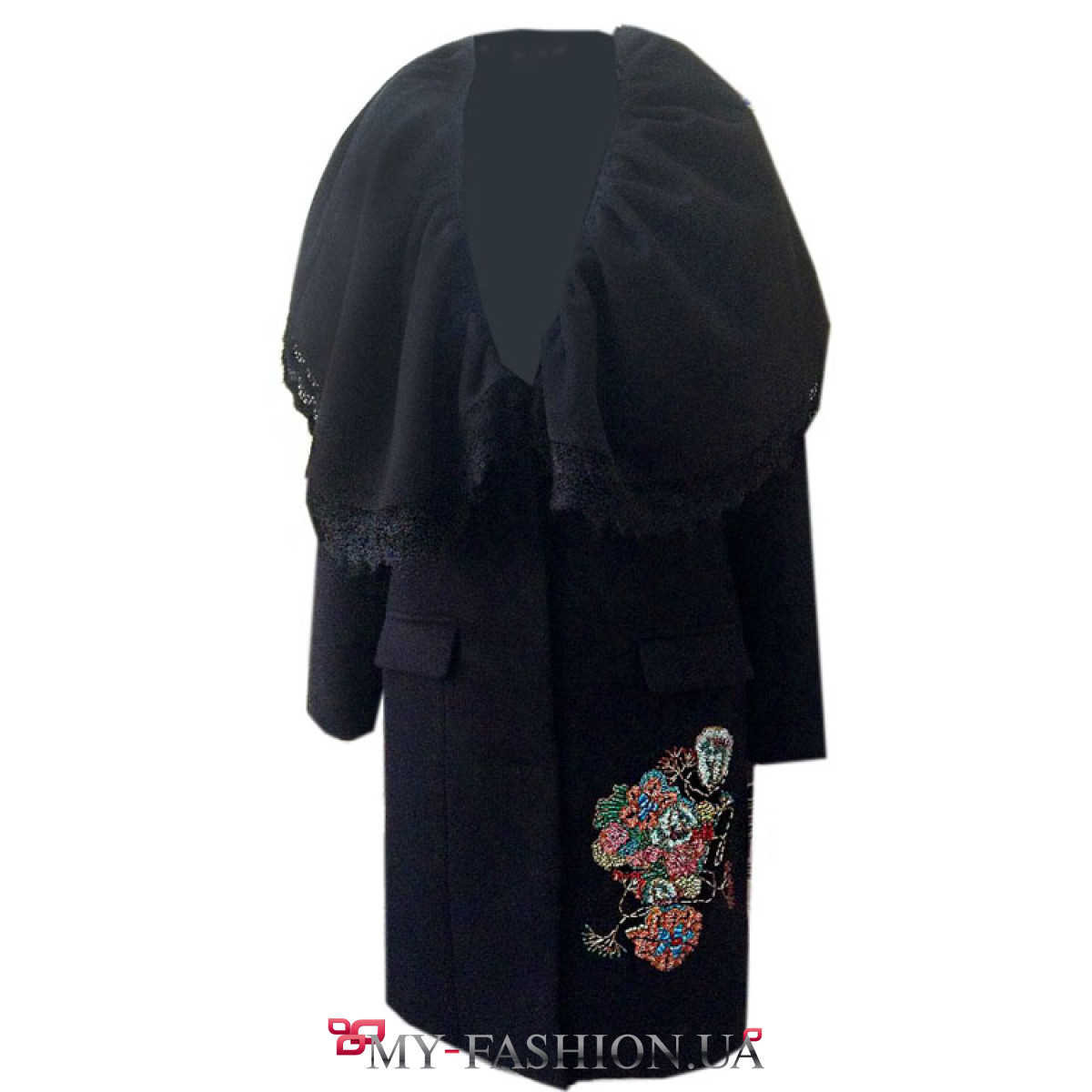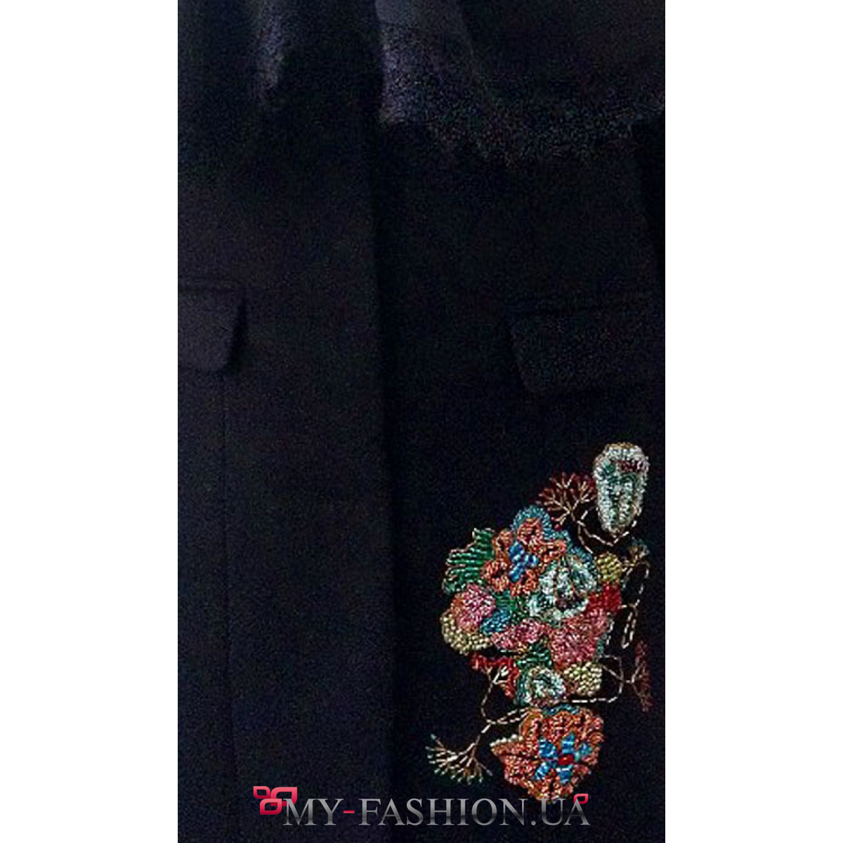 Черное кашемировое пальто с огромным воротником от Marikich. Роскошное пальто с вышитой правой полочкой множеством цветов из бисера и стекляруса. Вышивка ручной работы. Пальто теплое на подкладке, имеет косые карманы на полочке изделия. В наличии пальто размером S. Дополняйте свой яркий образ стильными клатчами от украинских дизайнеров.