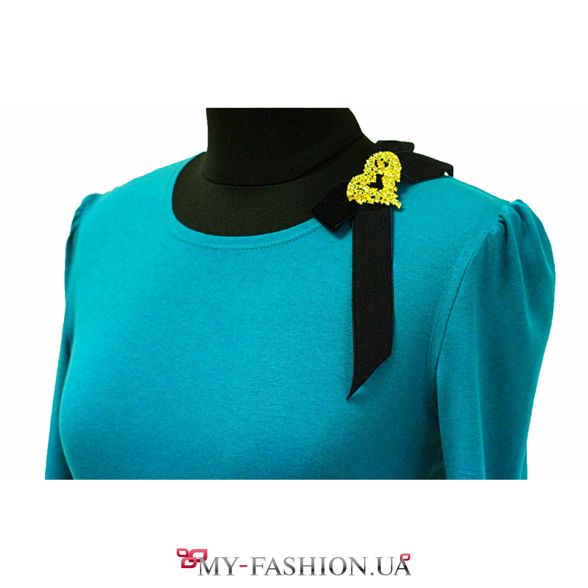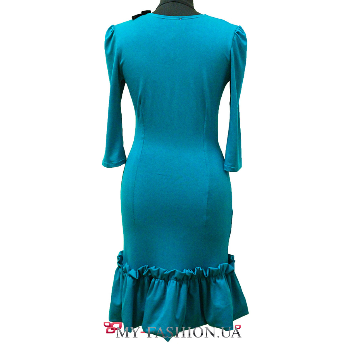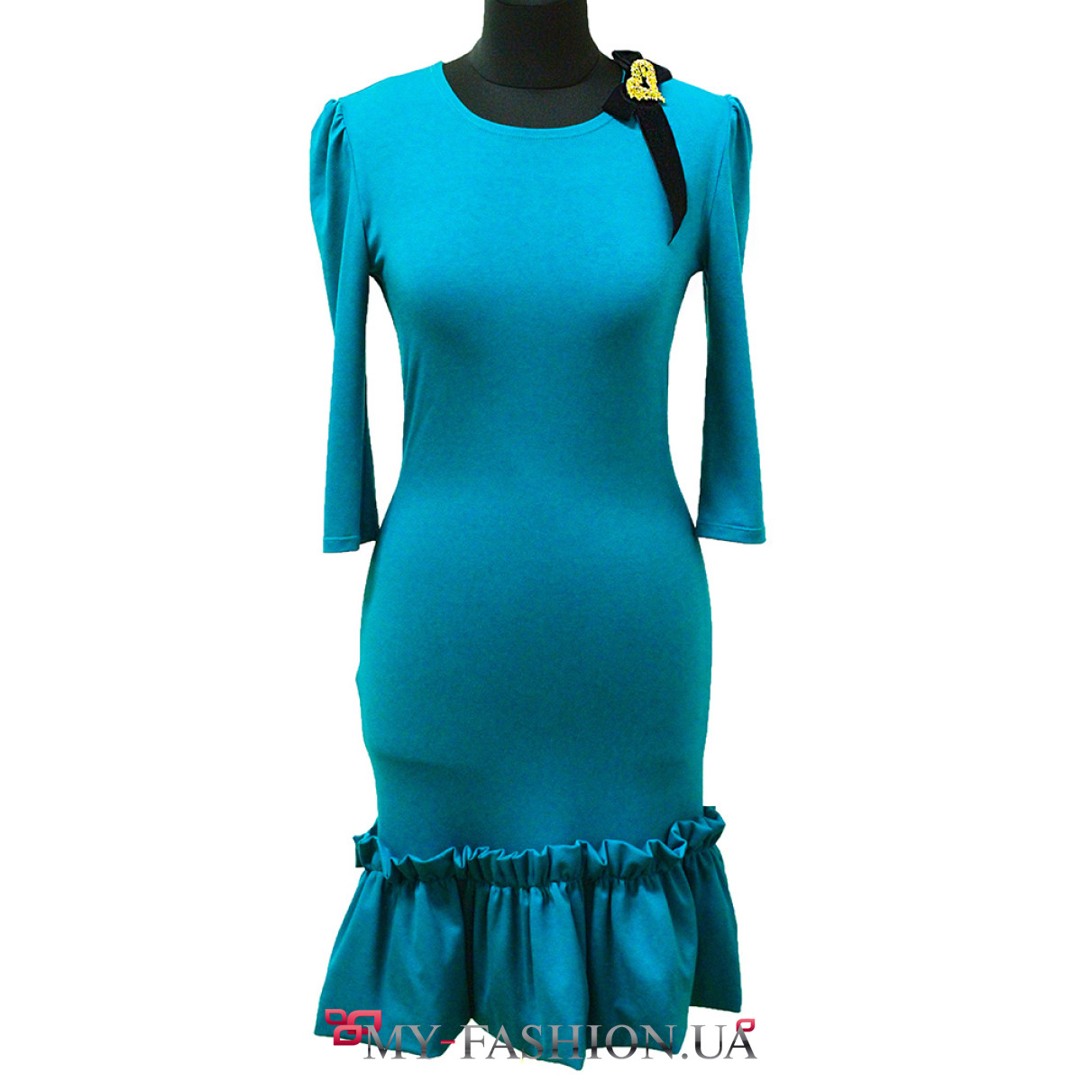 Привлекательное трикотажное платье насыщенного голубого цвета с узкими рукавами и скромной горловиной. Рукава украшены защипами в области плеча, полочка декорирована золотистой брошкой. По подолу юбки проходит необычный широкий пышный рюш. При индивидуальном заказе можно изменить форму брошки по вашему желанию. Этот наряд отлично дополнит маленькая замшевая сумочка-клатч. Материал: трикотаж. Наличие размеров уточняйте. Можно изготовить на заказ в любом необходимом размере.