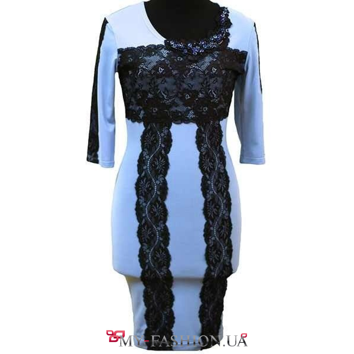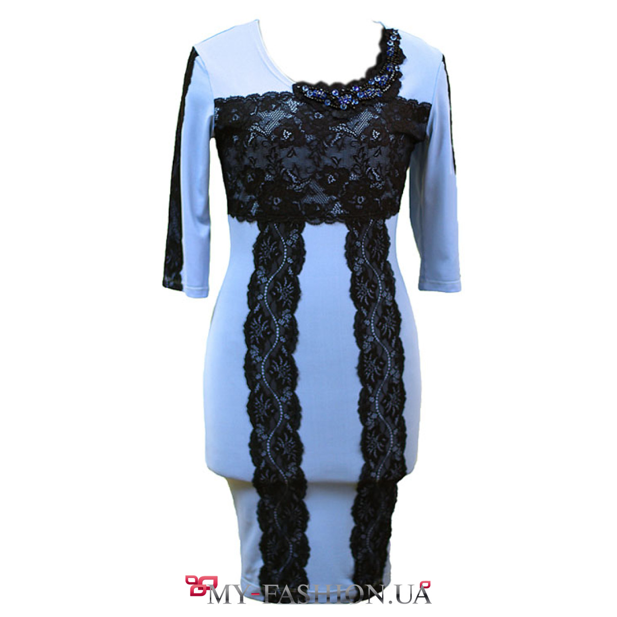 Платье из нежного, гладкого небесно-голубого трикотажа. Узкий силуэт обеспечивает максимальное облегание по фигуре. Стильное изделие декорировано кружевом по всей длине, воротник украшен вышивкой и блестящими бусинами. Очаровательное платье притягивает внимание, завораживает своей нестандартностью. Срез воротника полукруглый, рукава — три четверти, со вставкой из полупрозрачного чёрного кружева. Размер: S. Идеально подойдет для праздников, выгодно выделит вас из толпы.