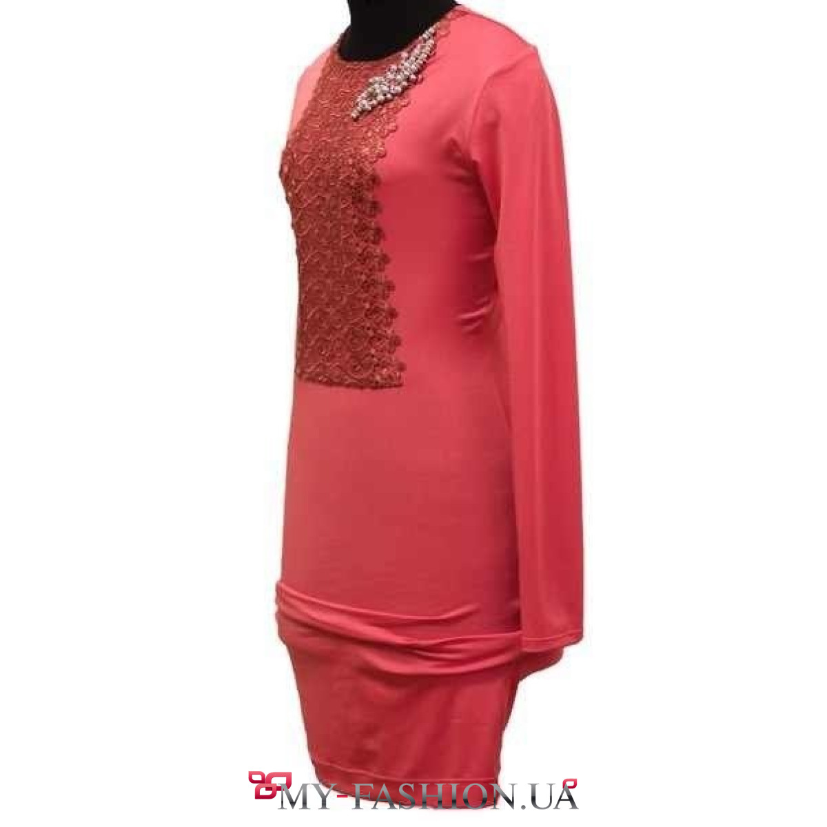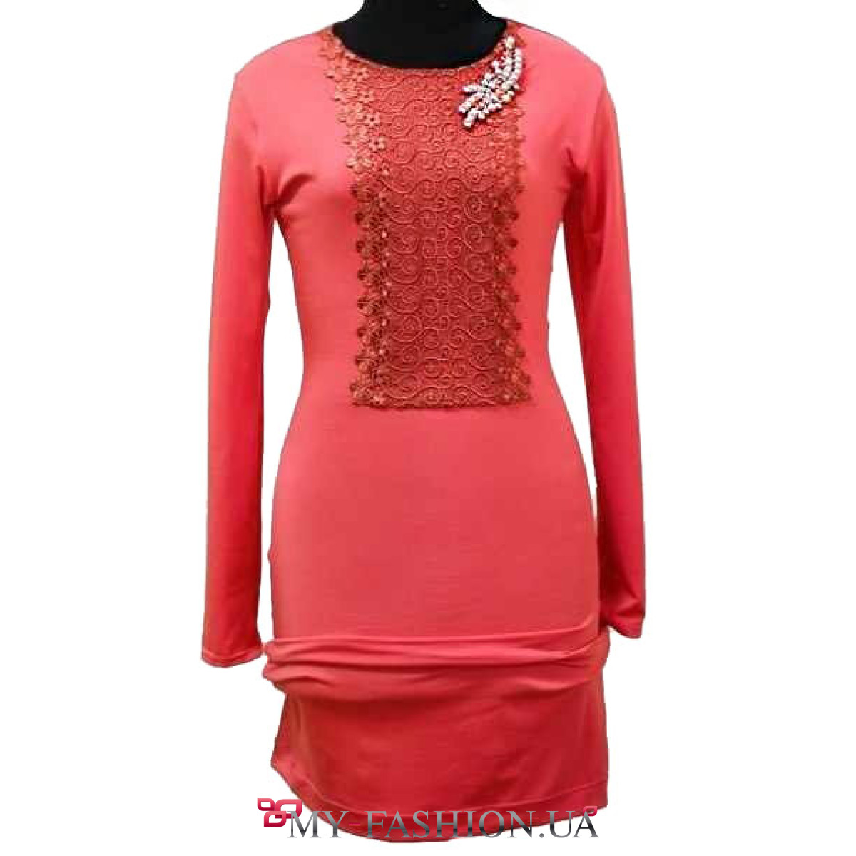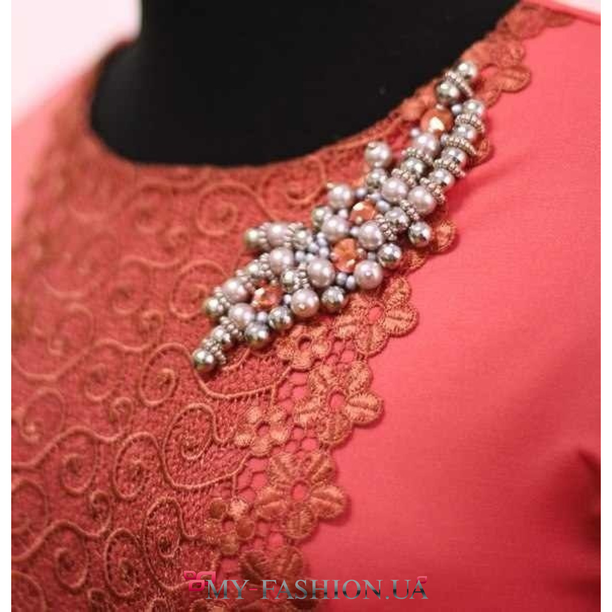 Это платье — новое слово во всеми любимой классике. Ровный крой, длина до колен, узкие ровный рукавчик, приталенный силуэт — всё это замечательно выглядит в ярком и нежном коралловом цвете. Срез горловины - полукруглый, ровный, неглубокий. Изделие украшено спереди широким кружевом на несколько тонов темнее, а также красивой брошью из жемчужных и блестящих бусин. Наряд идеально подходит для любого праздника. Размер: S.