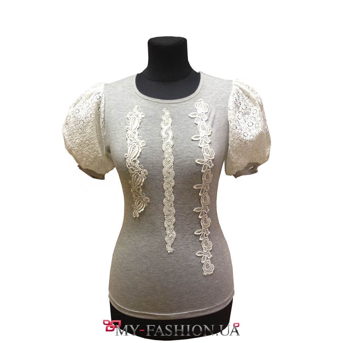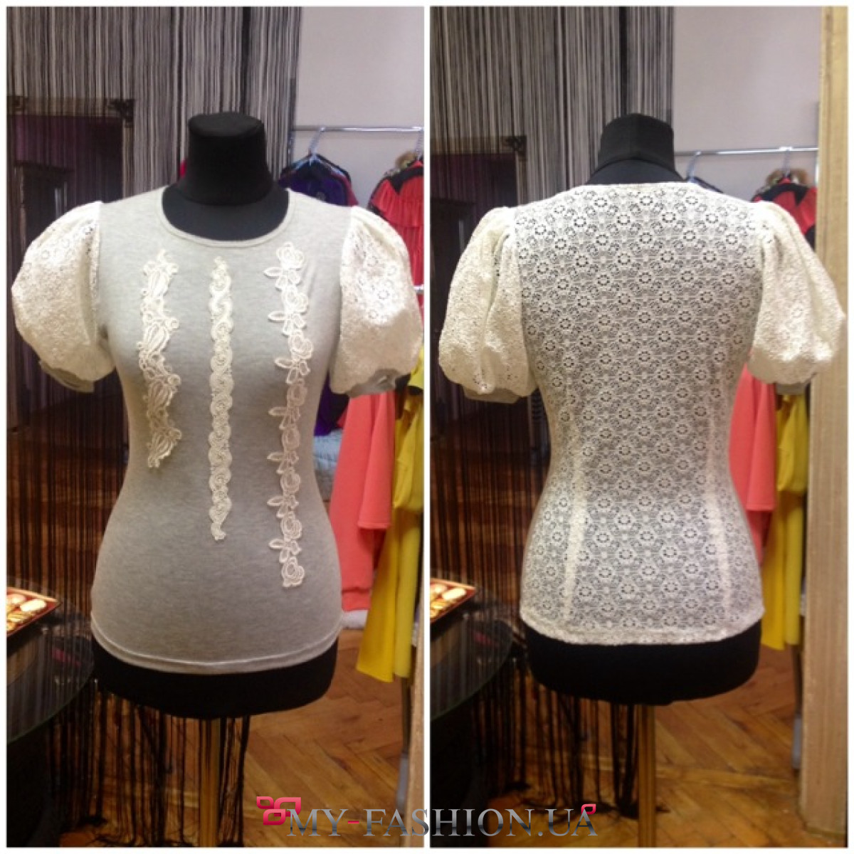 Оригинальная дизайнерская блуза выполнена из сочетания светло-серого трикотажа и молочного гипюра. Изделие эластичное и отлично обтягивает фигуру, подчёркивая достоинства. Рукава-фонарики и спинка выполнены из красивого ажурного гипюра, трикотажная полочка украшена вертикальными кружевными лентами. Эта блуза хорошо сочетается и с брюками, и с юбками любой длины. Материал: трикотаж, гипюр. В наличии размер S. Можно отшить на заказ в любом необходимом размере.