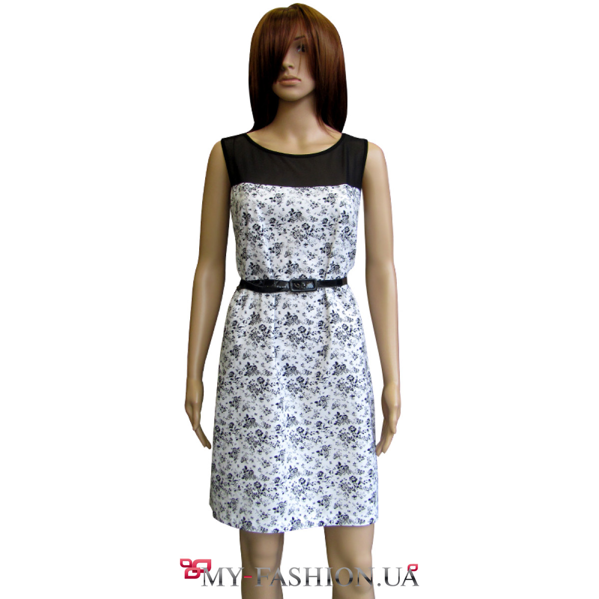 Стильное летнее платье из натуральной ткани светлого цвета — лучший выбор для жаркого времени года. Чёрная кокетка выполнена из хорошо продуваемой сетки и отлично подчёркивает цветочный принт на качественной ткани. Платье без рукавов, вырез горловины полукруглый, неглубокий. Юбка длиной достигает коленной чашечки. По желанию можно подчёркивать талию тонким чёрным пояском (пояс не идёт в комплекте с изделием). Состав: хлопок, отделка-сетка - полиэстер.Доступные размеры: XS, S, M, L.