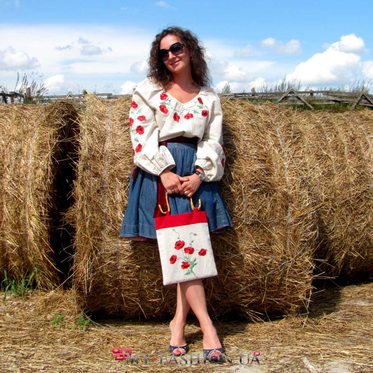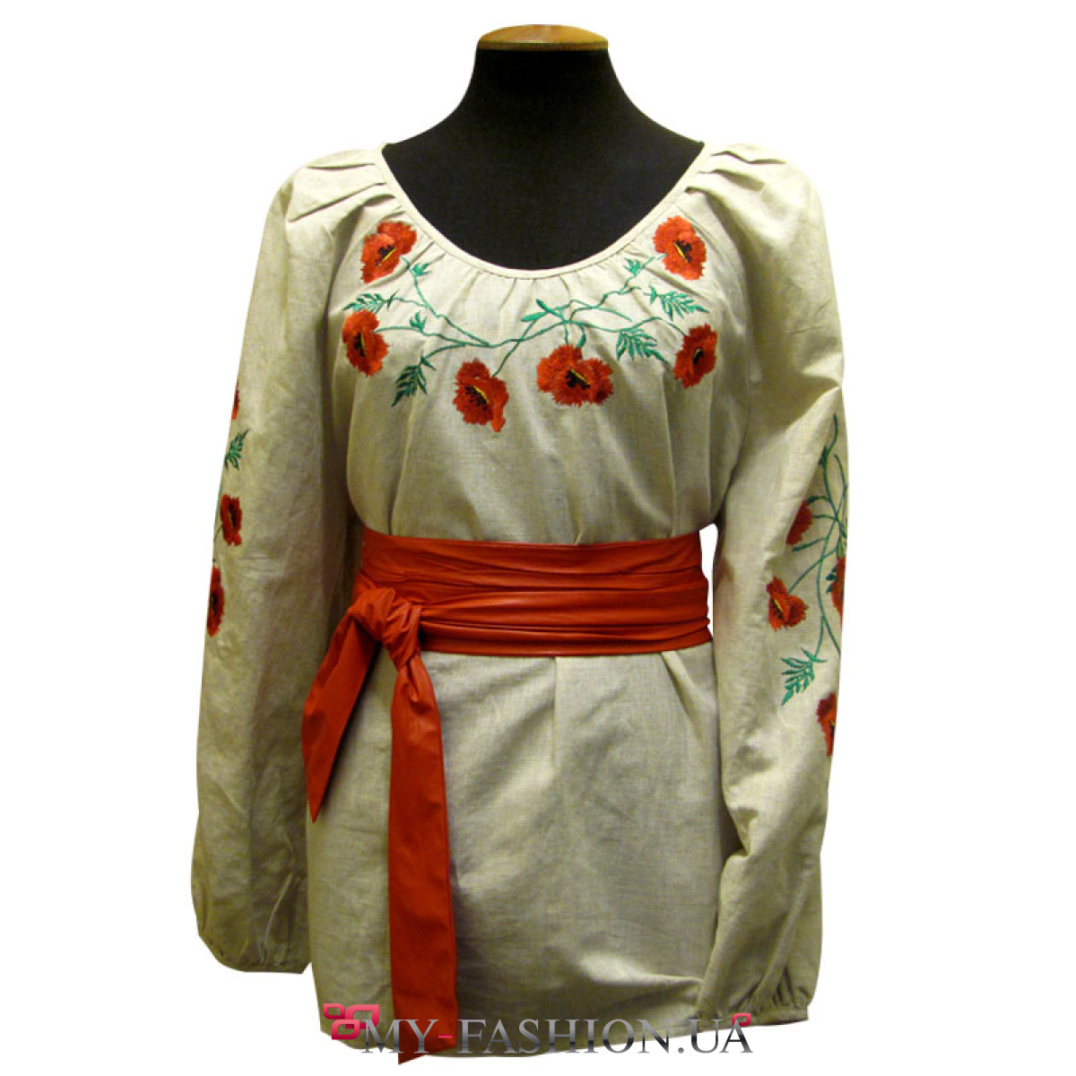 Красивая праздничная женская вышиванка выглядит очень ярко и эффектно. Изделие с оригинальным вырезом декольте треугольной формы с тонким белым кантом и мелкими складами на груди. Полочка и длинные свободные рукава щедро украшены красной вышивкой с изображением маков. Талию подчёркивает широкий аутентичный пояс-лента. Изделие изготовлено из качественной льняной ткани. Состав: 100% лён. Изделие выполнено в единственном размере. Возможен индивидуальный пошив.