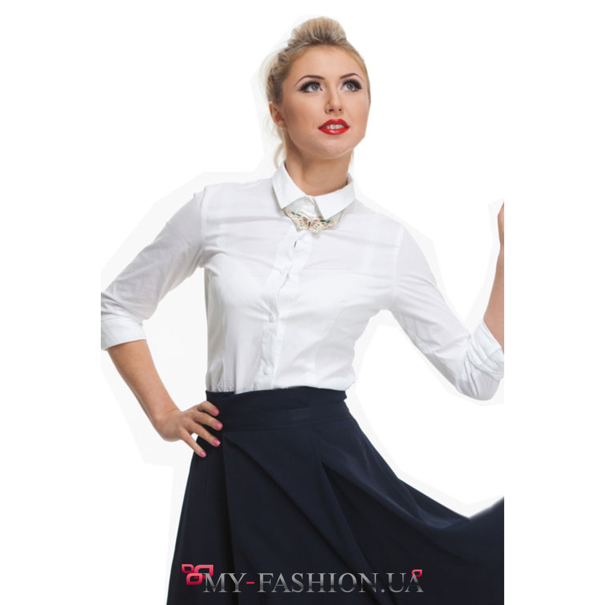 Белая хлопковая блуза- рубашка. Стильная блуза из хлопка и вискозы с рукавом 3/4, классическим воротником. Закрывается блуза на пуговицы и имеет манжеты внизу рукавов. Размеры от мала до велика.