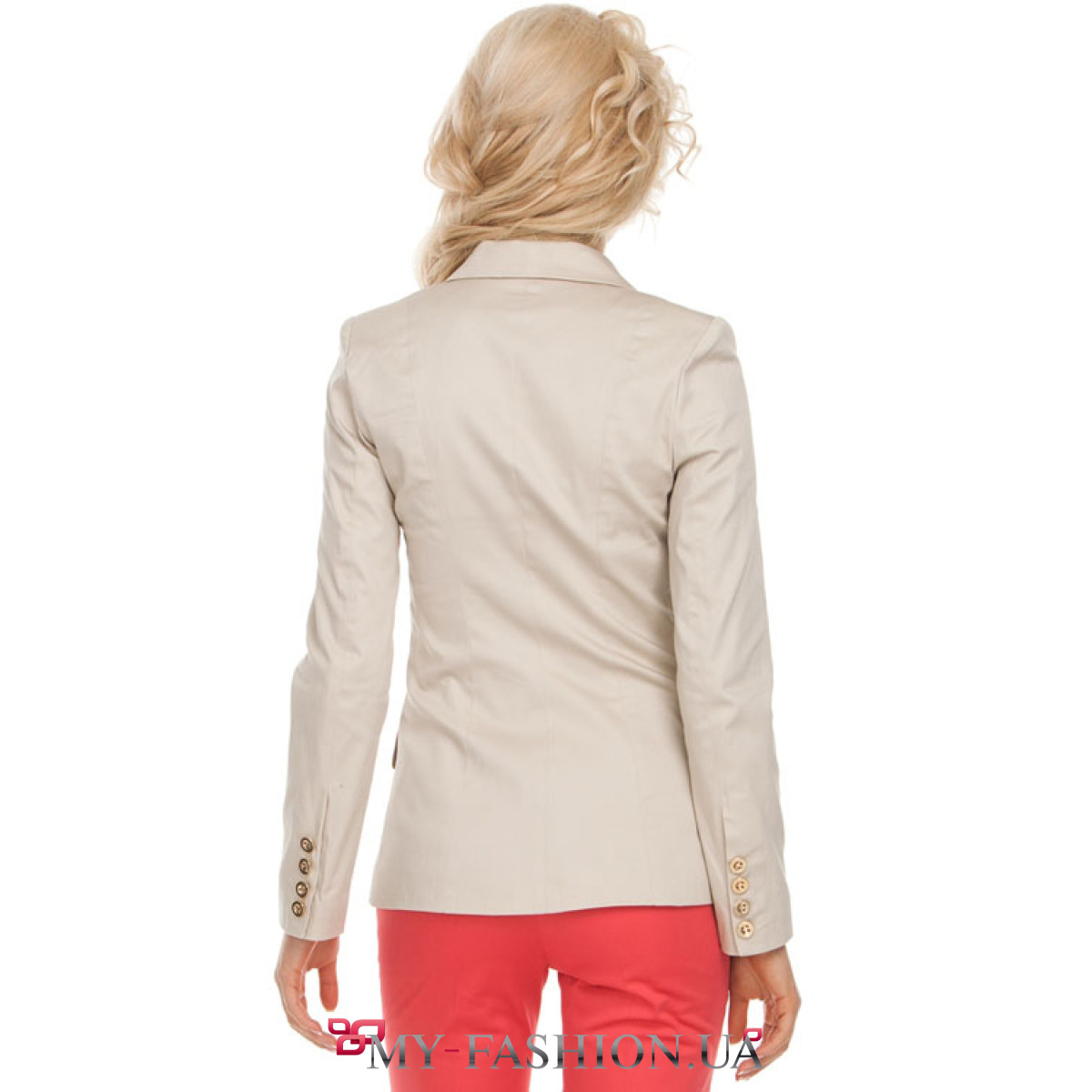 Классический дизайнерский жакет приятного светло-бежевого цвета. Изделие приталенного кроя имеет длинный узкий рукав и привлекательный воротник с отложными лацканами. Практичные небольшие карманы гармонично дополняют полочку. Жакет однобортный, застёгивается на две пуговицы. Эксцентричная и яркая модель, которая отлично сочетается с брюками и юбками. Материал: хлопковое полотно. Наличие размеров уточняйте. Можно изготовить на заказ в любом необходимом размере.