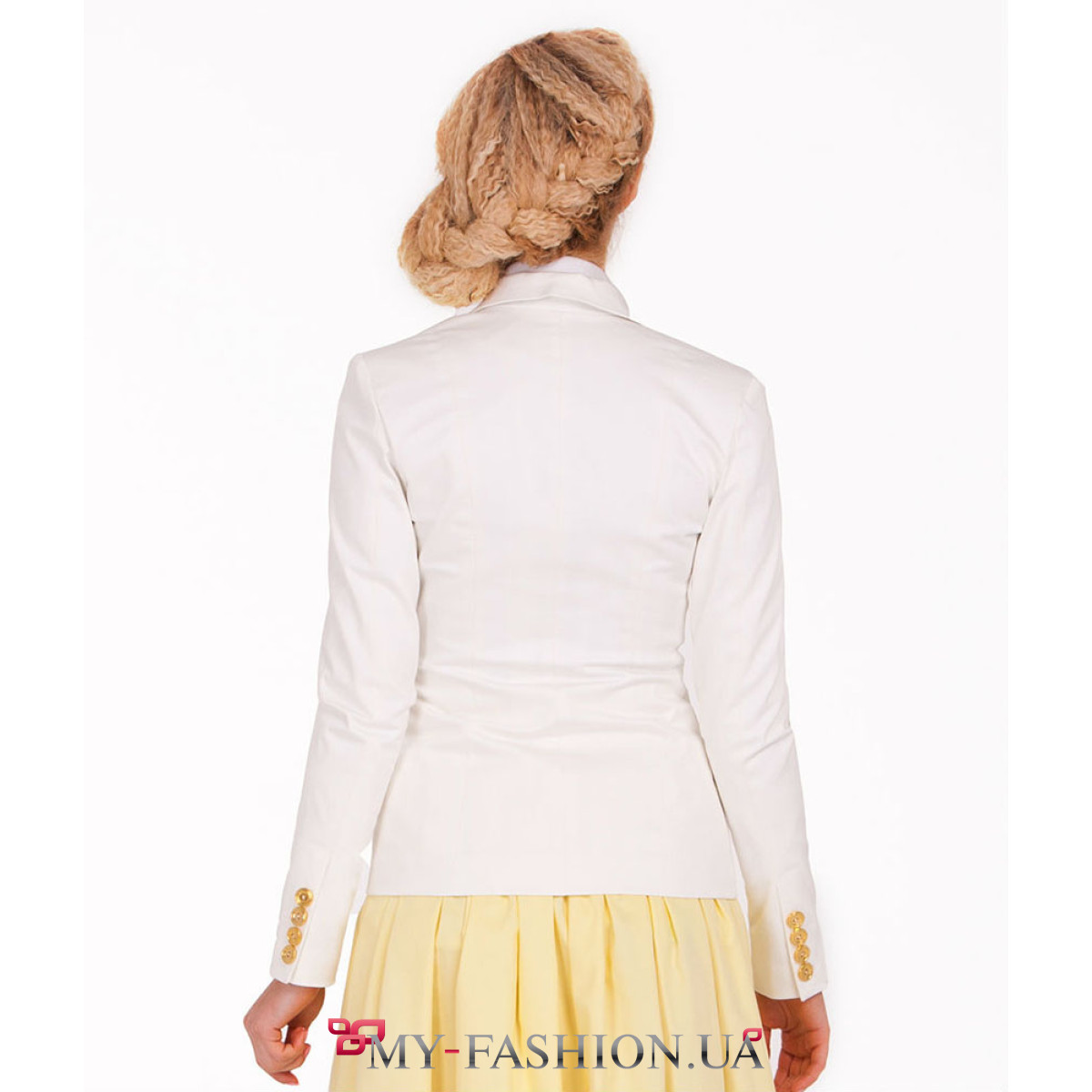 Дизайнерский белый жакет с оригинальной застёжкой на одну пуговицу. Изделие выполнено из высококачественной тонкой хлопковой ткани. Модель приталенного силуэта, имеет длинные рукава и классический воротник с отложными лацканами. Элегантный белый жакет прекрасно садится на любую фигуру, подчёркивая женственные изгибы. Сочетайте изделие с летним платьем нежного цвета или с любым другим нарядом. Состав: хлопок, эластан. Наличие размеров уточняйте. Можно изготовить на заказ в любом необходимом размере.