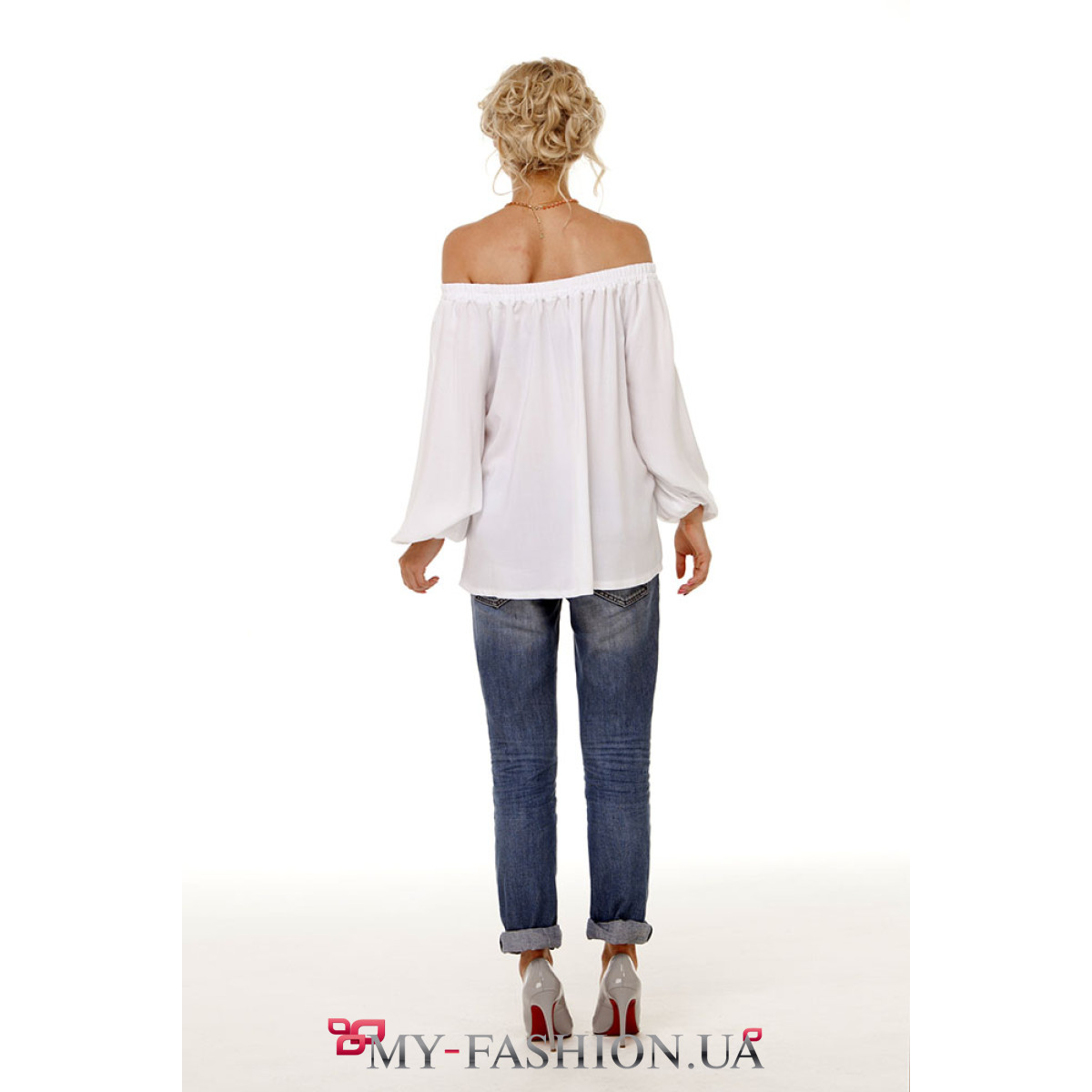 Стильная и универсальная летняя блуза классического белого цвета. Изделие выполнено из высококачественного полотна, очень приятного к телу. Блуза свободного кроя имеет широкую линию декольте с резинкой, которая позволяет эффектно открывать плечи. Длинные свободные рукава хорошо выглядят подтянутыми. Эта модель отлично сочетается с брюками, джинсами и юбками любых фасонов. Состав: хлопок, вискоза. Наличие размеров уточняйте. Можно изготовить на заказ в любом необходимом размере.