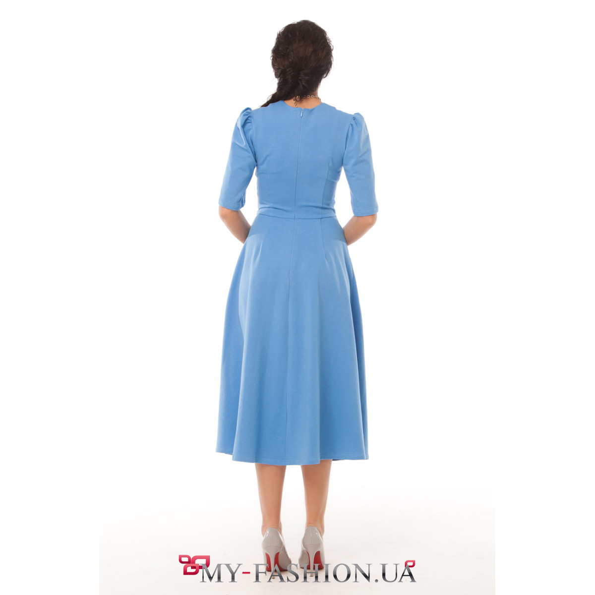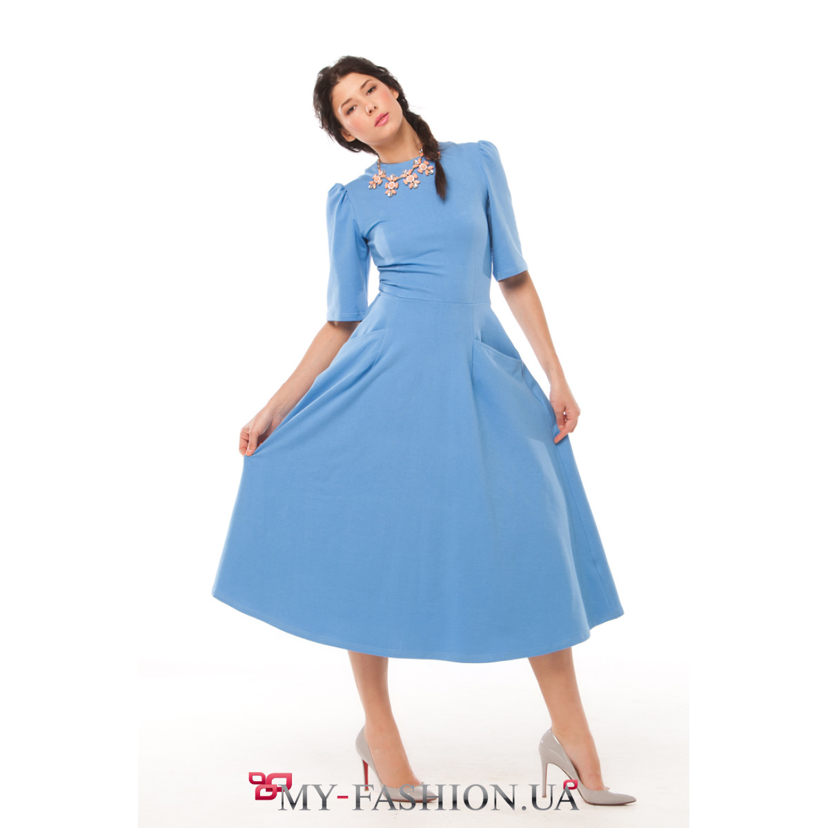 Если вам нужен повседневный и праздничный наряд одновременно, то это платье — идеальное решение. Изделие красивого нежно-голубого цвета с волнующей юбкой, полностью закрывающей колени, хорошей посадкой по фигуре и ровным срезом горловины сделает вас центральной фигурой на любом мероприятии. Украшение платья — небольшие вздёрнутые фонарики на рукавах. Сочетайте с большим ярким колье для дополнения образа. Состав: 86% - хлопок, 11% - полиэстер, 3% - лайкра.