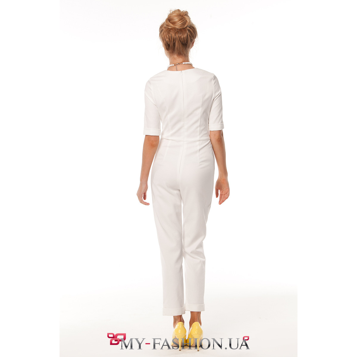 Стильный лёгкий комбинезон из приятного на ощупь белоснежного жаккарда с рельефным узором. Длина штанины - до косточки, рукавчик — до локтя, вырез горловины полукруглый, неглубокий. Вытачки обеспечивают прекрасную посадку по фигуре. Удобные карманы позволят вам всегда брать с собой всё необходимое. Комбинезон застёгивается на длинную потайную молнию на спинке. Идеально подходит для жаркого лета, хорошо сочетается с тонким ярким пояском на талии. Материал: жаккард. Состав: 61% - полиэстер, 36% - хлопок, 3% - эластан. Доступен в разных размерах.