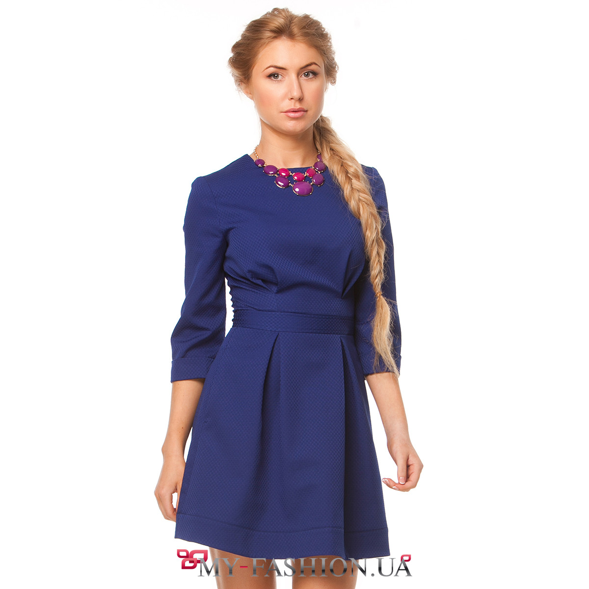 Стильное короткое платье тёмно-синего цвета удивит вас необычным кроем и отличной посадкой по фигуре. Короткая юбка украшена смелыми широкими складами. Аккуратные мелкие складочки на груди визуально увеличивают объём и подчёркивают контраст с тонкой талией. Свободные рукава-фонарики закрывают локоть и заканчиваются стильными манжетами. Вырез горловины полукруглый, под шею, что позволяет сочетать платье с любыми аксессуарами. Материал: хлопок. Доступно в разных размерах.