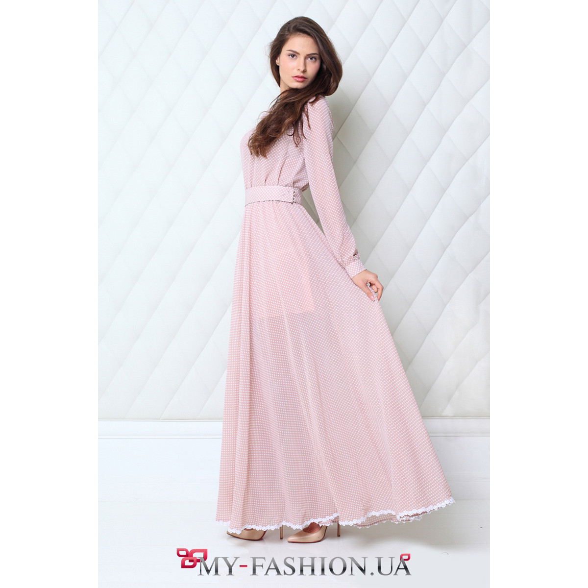 Нежное романтичное платье из лёгкого светло-розового шифона в мелкий бежевый горошек — идеальное решение для романтичных леди. Вы будете выглядеть просто великолепно в этом тонком длинном наряде. Оригинальная отделка тонким кружевом подчеркнёт стройность силуэта и добавит свежести образу. Расклешенная юбка позволит ощутить свободу движений и подчеркнёт элегантность. Материал: шифон. Состав: вискоза - 90%, полиэстер - 10%. Доступные размеры: XS, S, M.