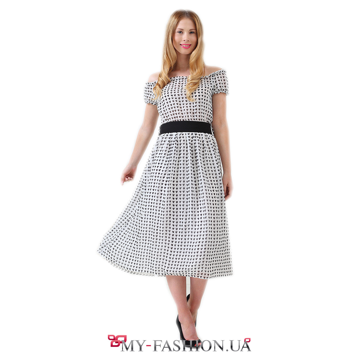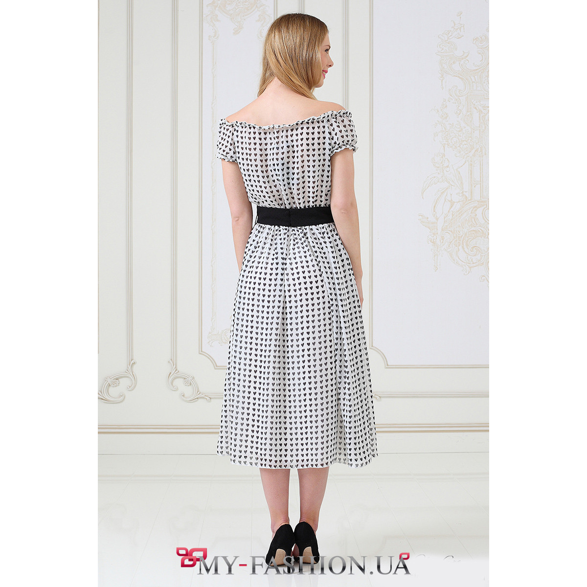 Яркое лёгкое платье-миди отлично подойдёт для ношения жарким летом. Свободный фасон изделия дарит полную свободу движений, талию можно подчеркнуть широким чёрным поясом (пояс идёт в комплекте). Широкая горловина и рукава посажены на резинку с маленькой декоративной оборкой. Платье можно носить спущенным с плеч, на одно плечо или же традиционно. Изделие без застёжки. Состав: вискоза - 90%, полиэстер - 10%. Доступные размеры: S, M, L.