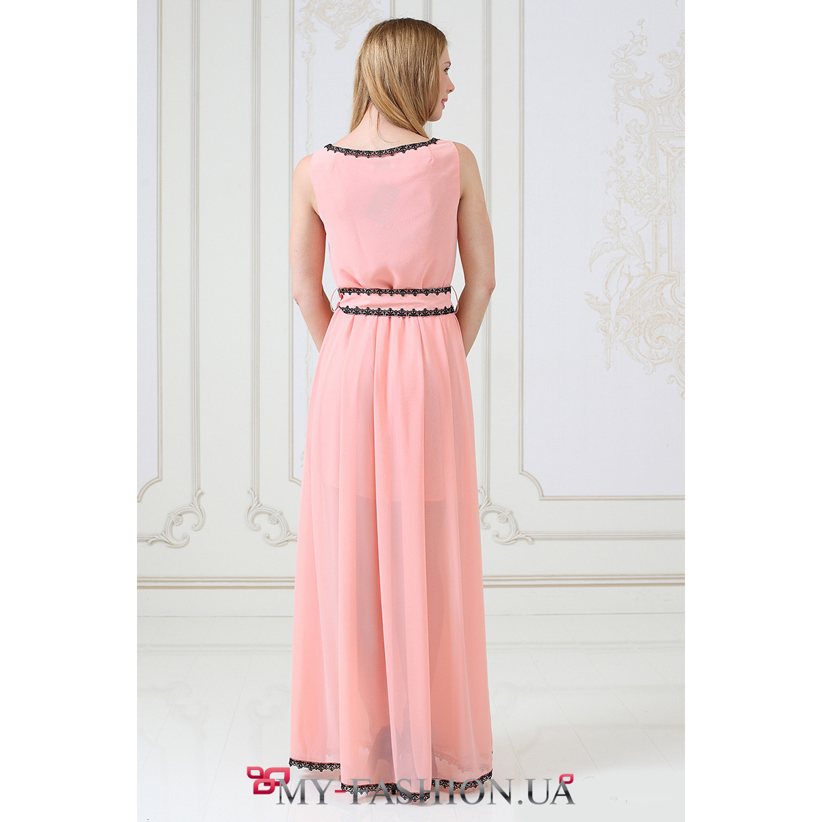 Длинное платье персикового цвета украинского производства. Летнее шифоновое платье - необходимая вещь в гардеробе каждой модницы. Прекрасный вариант изделия как на каждый день, так и для торжественного мероприятия. Юбка максимальной длины со множеством мягких спадающих склад украшена кружевом по низу. Полочка имеет рельефы для максимального подчеркивания фигуры. Широкий пояс платья украшен контрастным кружевом, как и подол. Изделие идеальной посадки, такая модель всегда актуальна и привлекает восторженные взгляды. Состав: вискоза - 90%, полиэстер - 10%. Размеры: S, M, L.