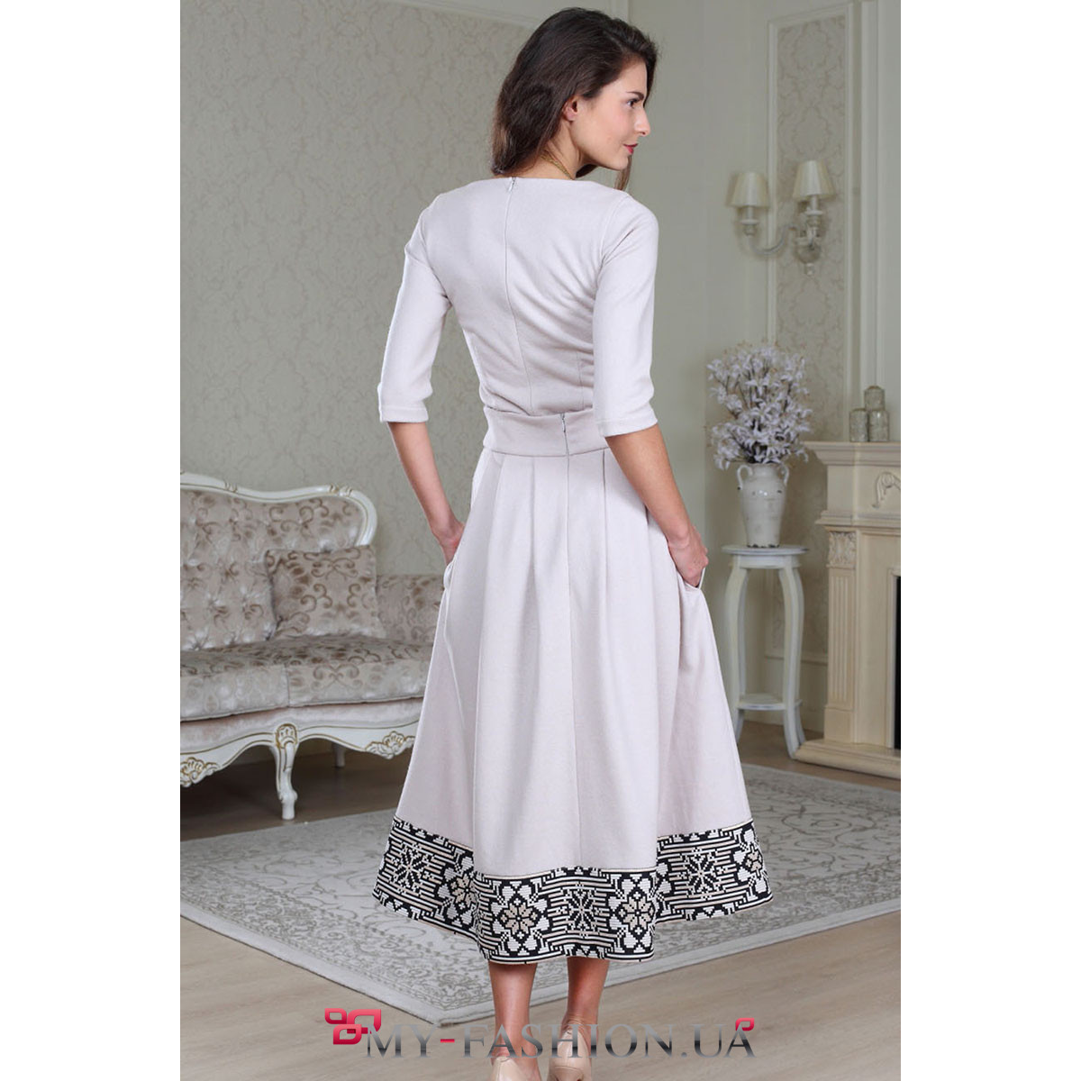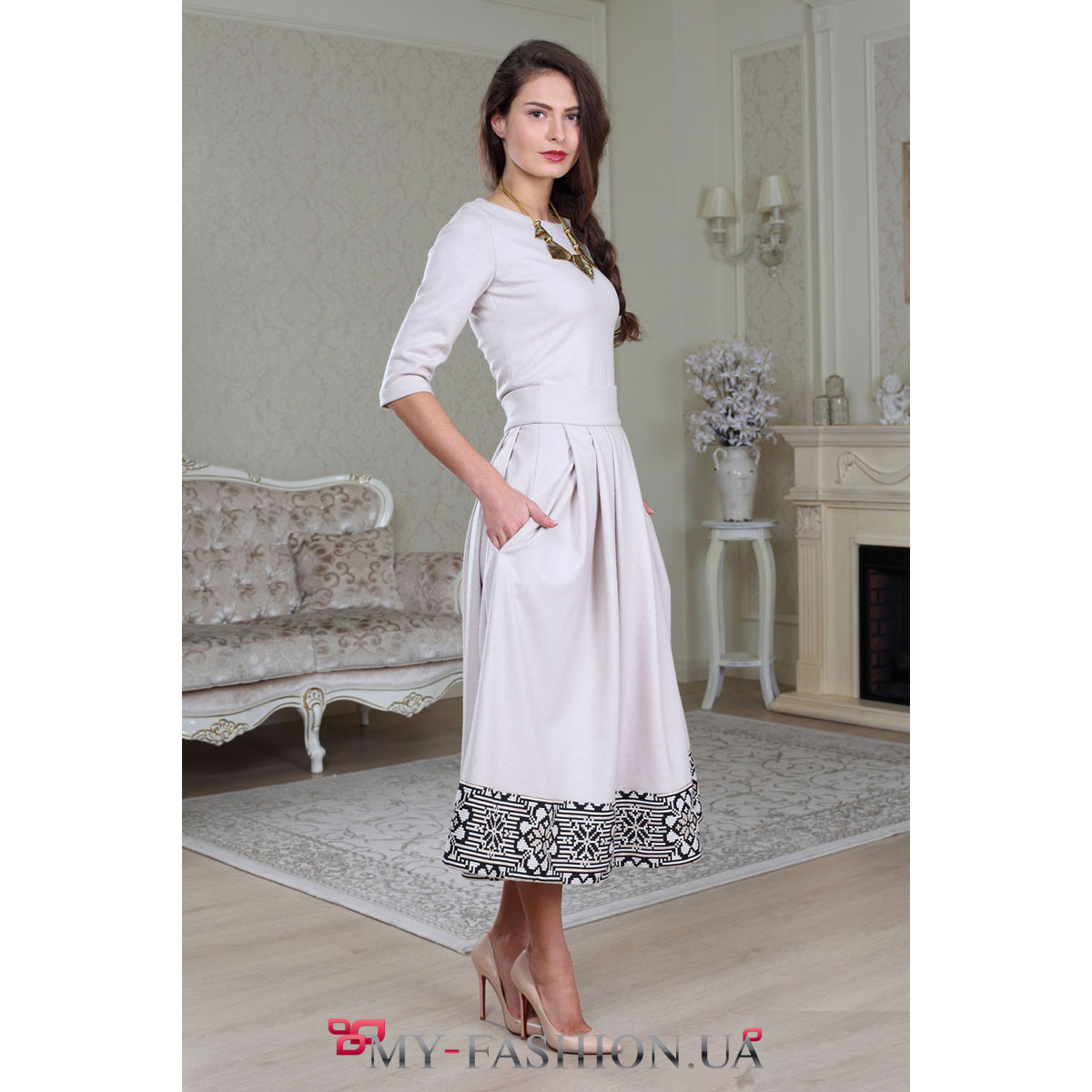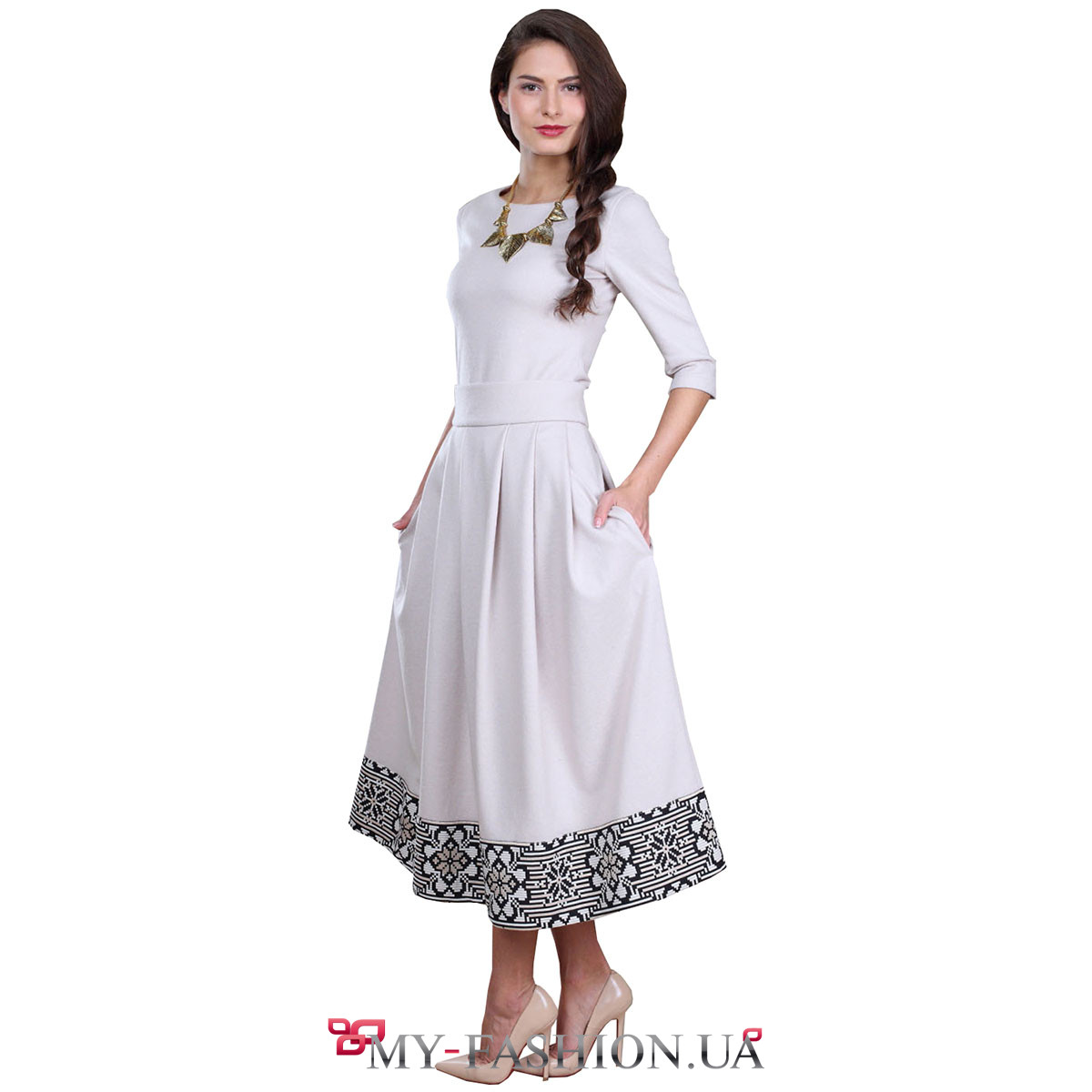 Красивая и оригинальная юбка-миди приятного бежевого цвета. Изделие изготовлено из шерстяного трикотажа и имеет широкую декоративную вставку французского жаккарда по подолу. Юбка посажена на плотный пояс, в котором закреплены глубокие склады, создающие мягкие волны и элегантный женственный силуэт. Юбка не только отлично подчёркивает фигуру, но и очень удобна в ношении, а также проста в сочетаниях. В наличии размеры XS, S, M, L.