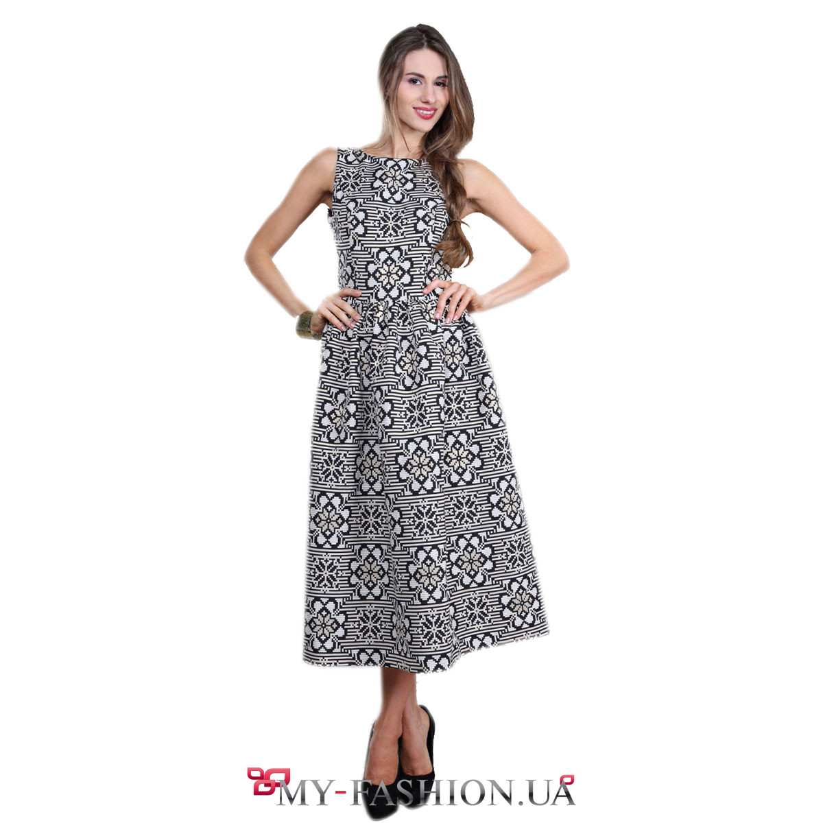 Стильное чёрно-белое платье средней длины с красивым орнаментом. Изделие выглядит очень интересно и необычно, а также моделирует фигуру, максимально приближая её к типу "песочные часы". Платье без рукавов, спинка интригующе открыта. Застёгивается на пуговицу на затылке. Юбка с большими складами расклешённая от линии талии и отлично держит форму. Изделие хорошо выглядит с обувью на высоком каблуке. Материал: французский жаккард. В наличии размеры XS, S, M, L.