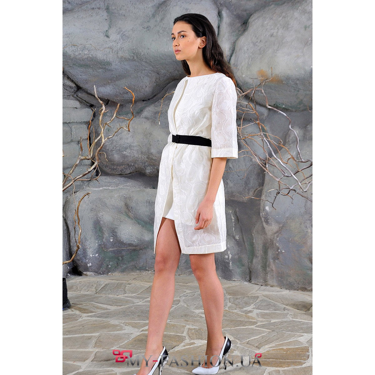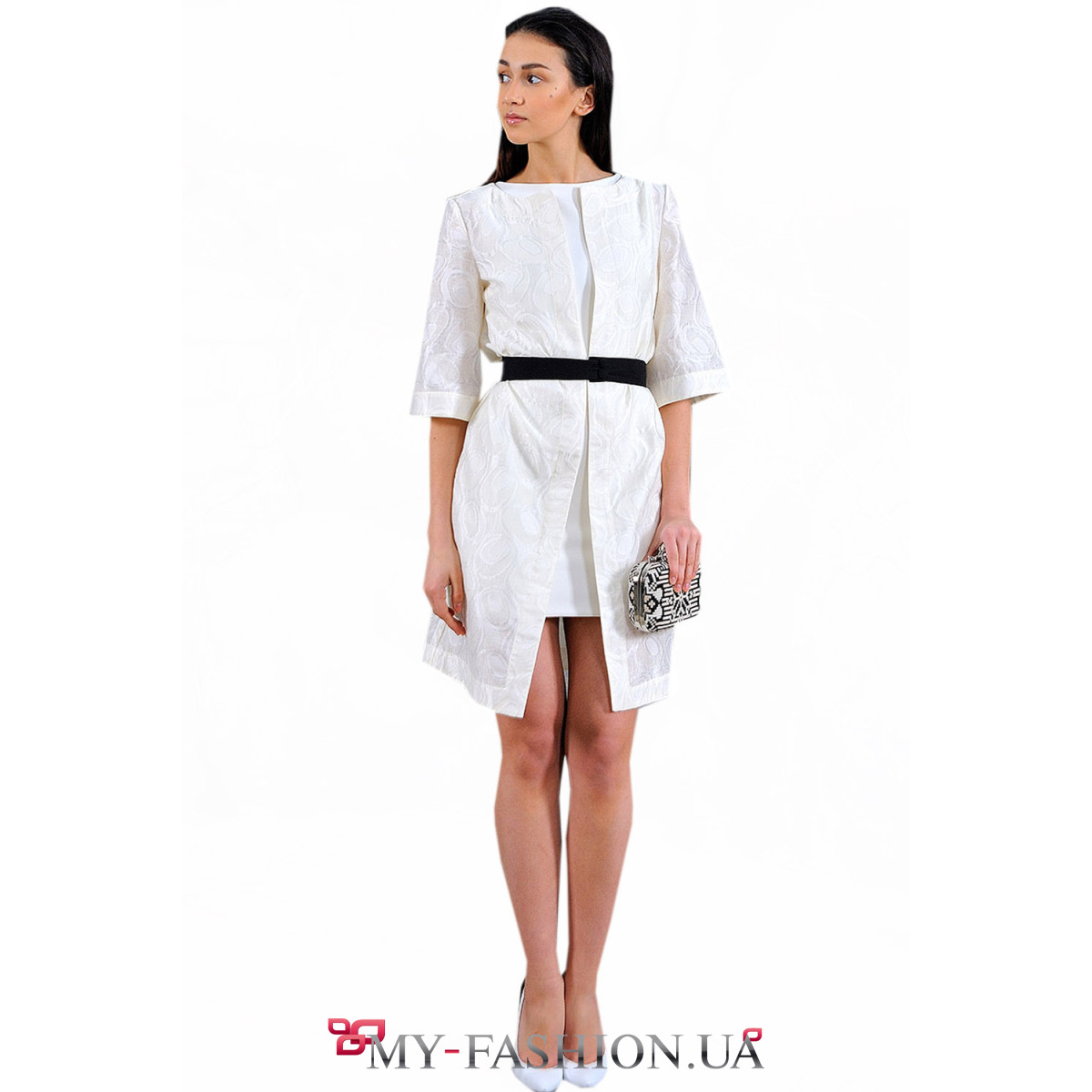 Красивый дизайнерский пиджак удлинённой модели из качественной ткани на натуральной основе. Материя с рельефным узором в тон прекрасно выглядит и проста в уходе. Изделие с широким рукавом до локтя, без вырезов, воротника и застёжек. Крепится на талии под пояс, отлично сочетается с классическими сумками из натуральной кожи. Материал: хлопок. Размер одежды на модели: XS. Рост модели: 176 см. Длина по спинке: 94 см. Можно изготовить на заказ в любом необходимом размере.