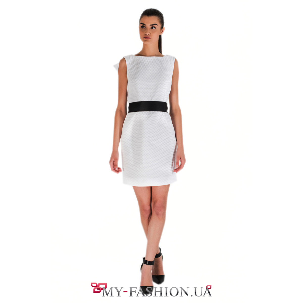 Красивое коротенькое платье без рукавов приталенного кроя станет прекрасным нарядом для летней погоды. Изделие имеет рельефные вытачки и интригующую открытую спинку, юбка прямого кроя. Пояс идёт в комплекте. Лёгкая материя идеально подходит для ношения жарким летом. Изготовлено из качественной ткани на натуральной хлопковой основе с приятным на ощупь рельефным узором. Состав: хлопок - 95%, полиэстер - 5%. Наличие размеров уточняйте. Можно изготовить на заказ в любом необходимом размере.