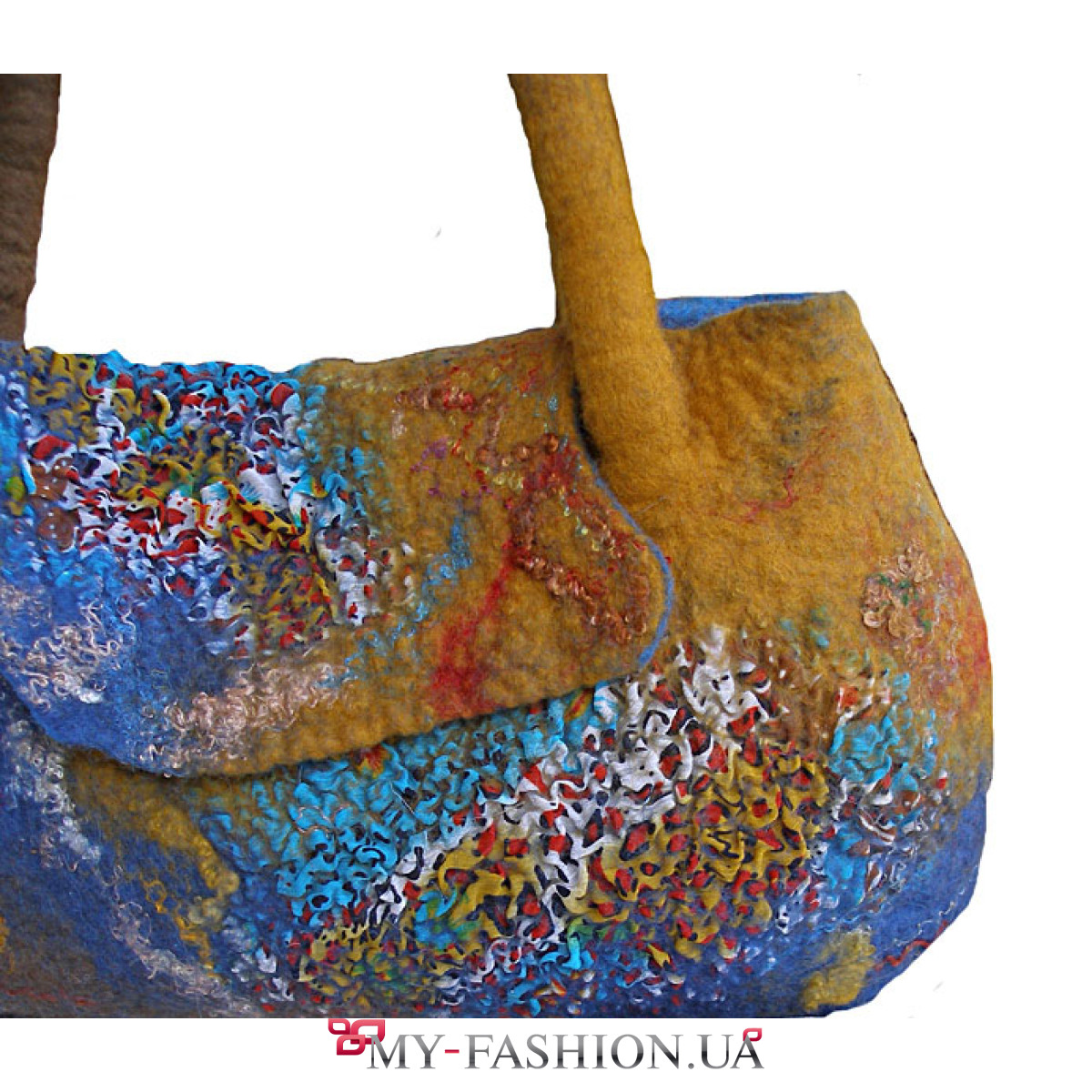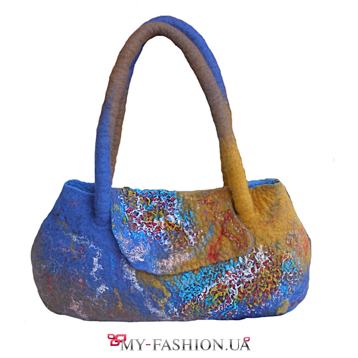 Сумка желто- синяя, выполнена в технике мокрого валяния цельноваляная , без швов, внутри привален карман. Застежка-молния. Клапан застегивается на магнитную застежку. Материалы: шерсть меринос 100 %, декоративные волокна льна, шелка, шифон. Размеры: 37х20 см. длина ручки 27см. А если к этому ещё купить боди - то вы будете просто неотразимы!