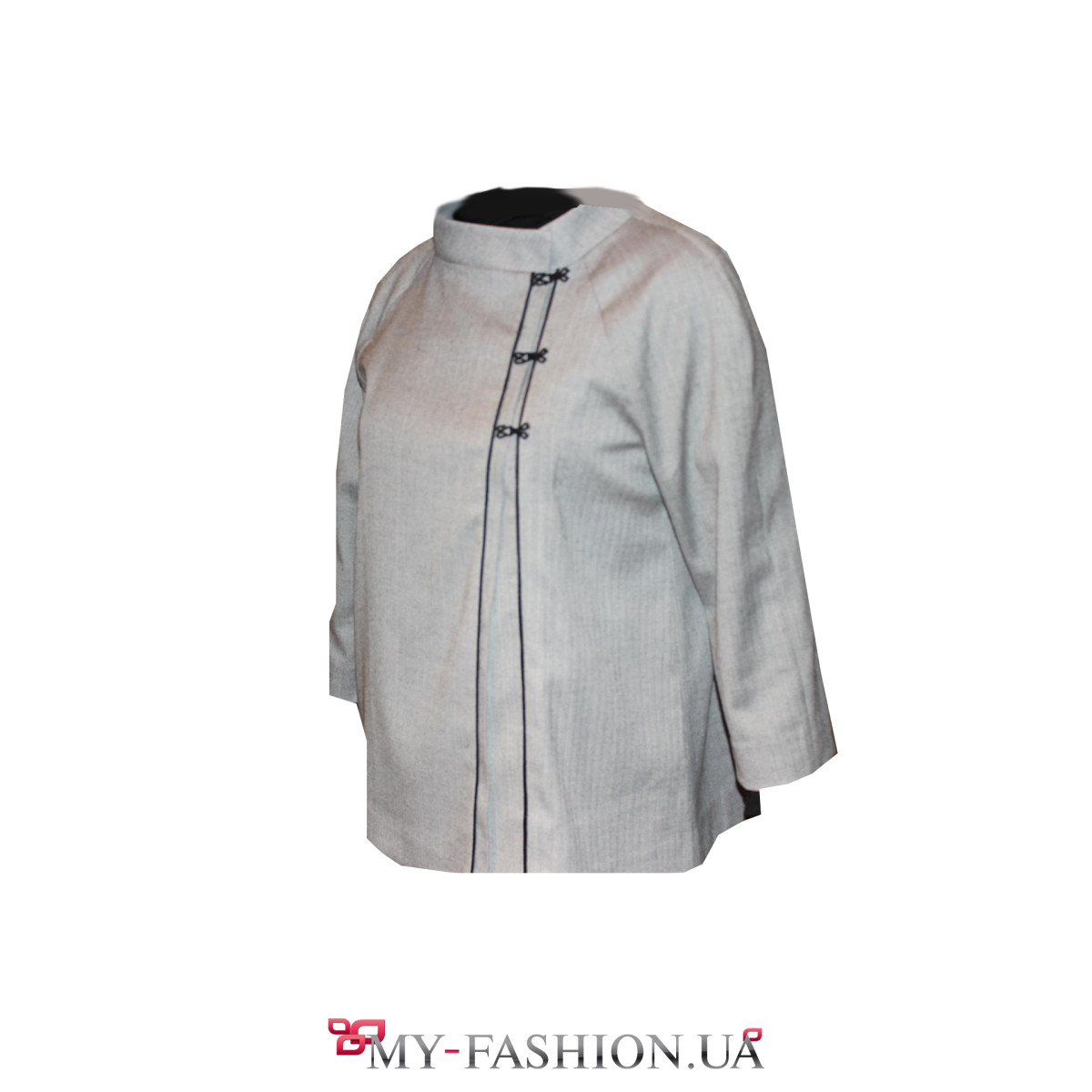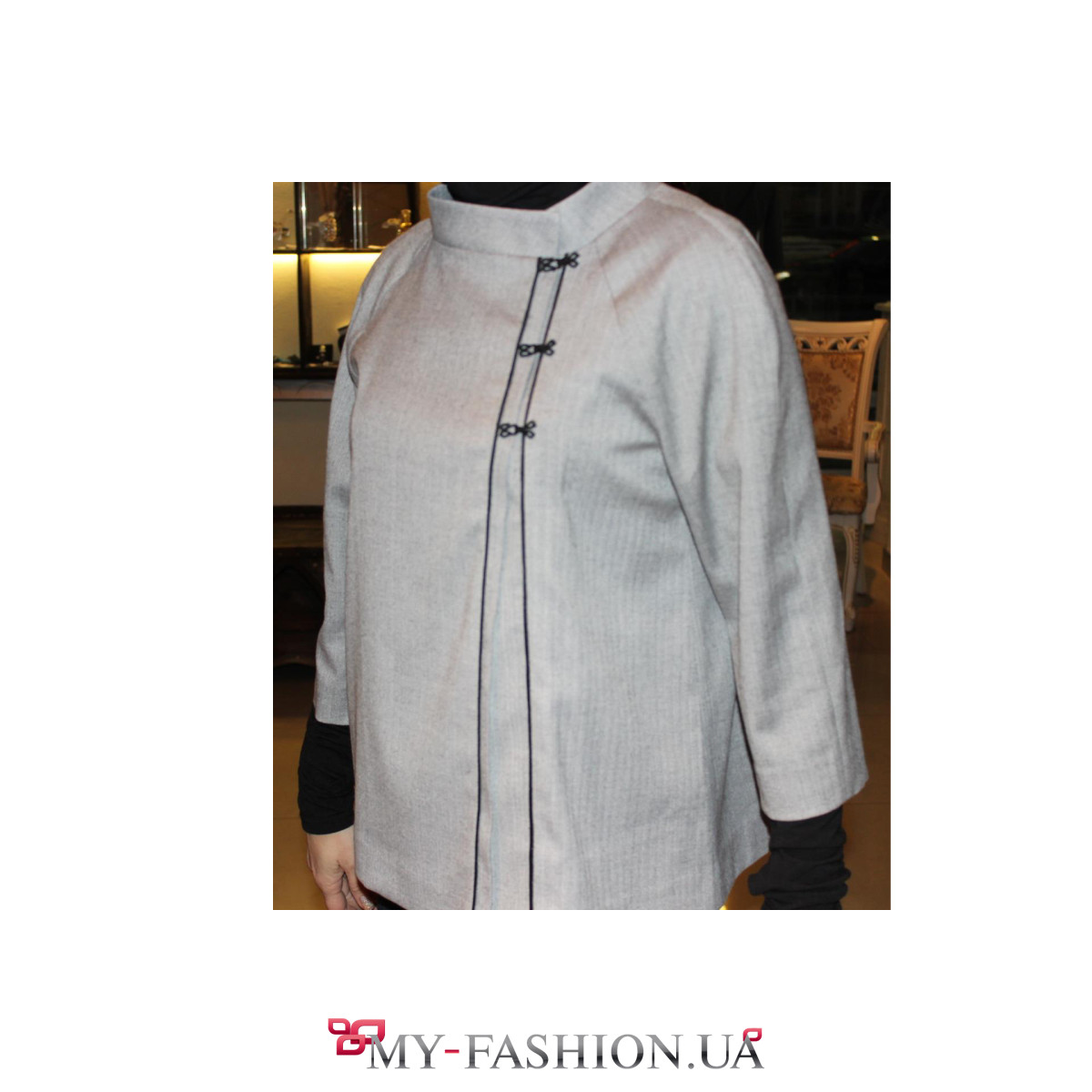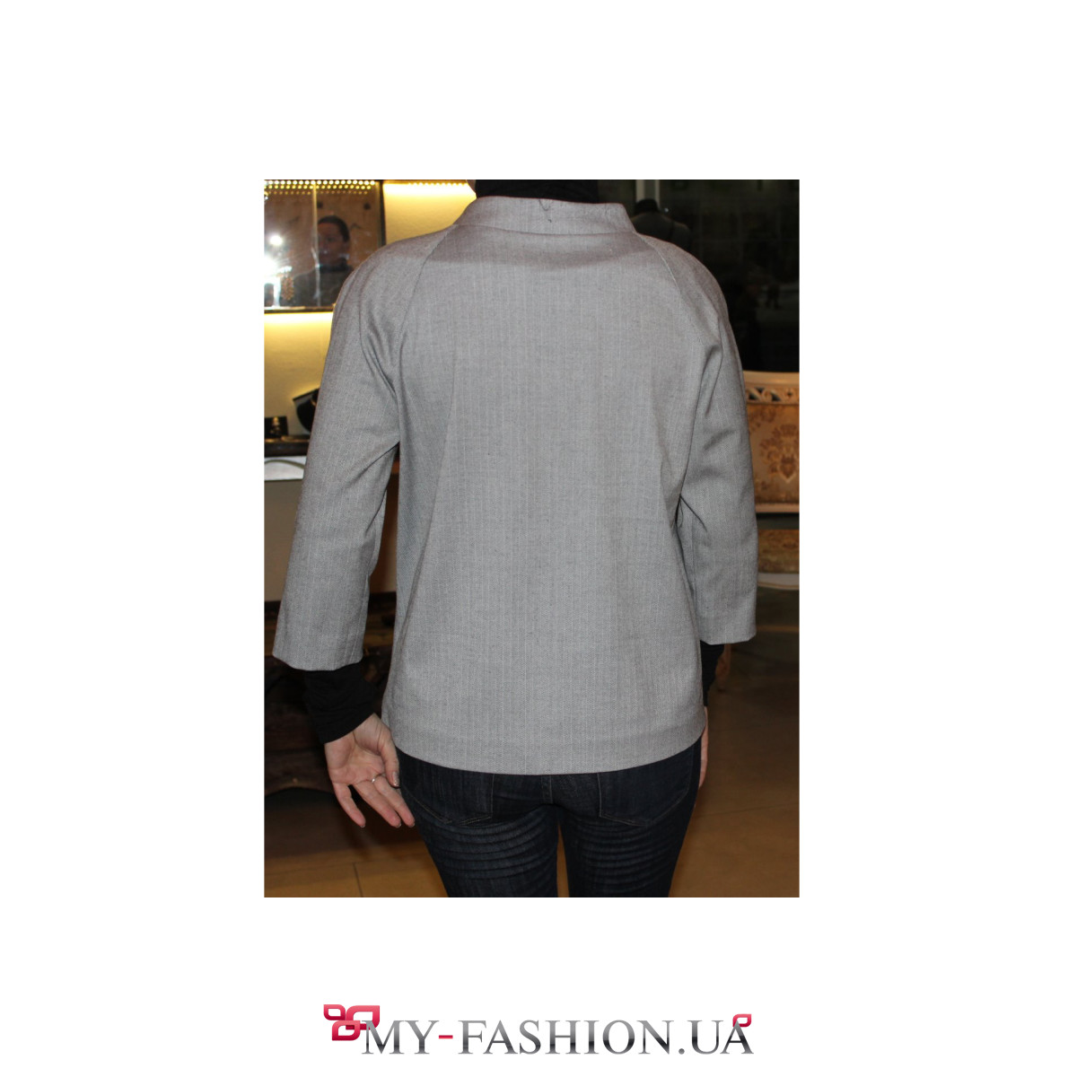 Стильный жакет свободного кроя с широкими укороченными рукавами. Изготовленное из качественной светло-серой натуральной шерсти изделие не позволит вам замерзнуть в любое время года. Красивый воротник-стойка является прекрасным украшением наряда. Застегивается на трёх крючках. Особенностью этого изделия является его уникальность: эта модель жакета замечательно смотрится как на больших размерах, так и на миниатюрных девушках, подчеркивая их хрупкость.