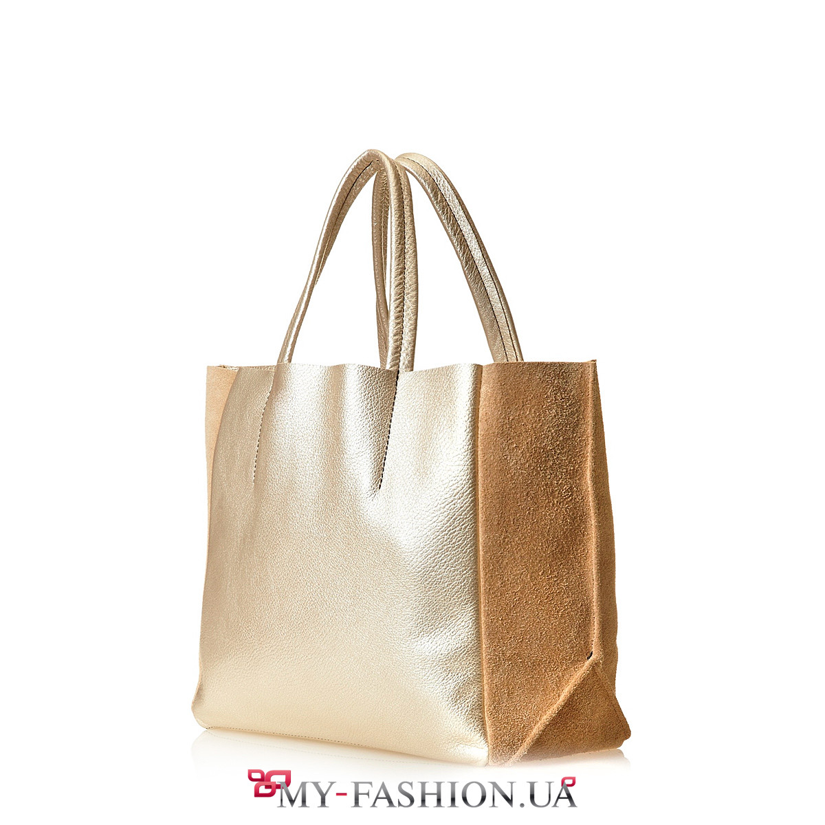 Лаконичная сумка из высококачественной натуральной кожи яркого золотого цвета станет роскошным и удобным дополнением к вашему наряду. Изделие без дополнительного декора с необработанными срезами, которые выглядят очень стильно и современно. Внутри одно отделение и карман на молнии. Сумочка не застёгивается, полукруглые ручки позволяют носить её на плече. Материал: натуральная кожа. Размеры изделия: ширина - 47 см, высота - 32 см, высота с ручками - 50 см.