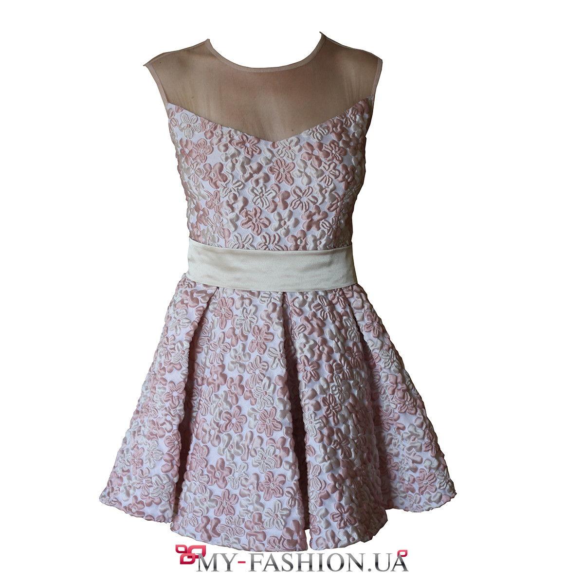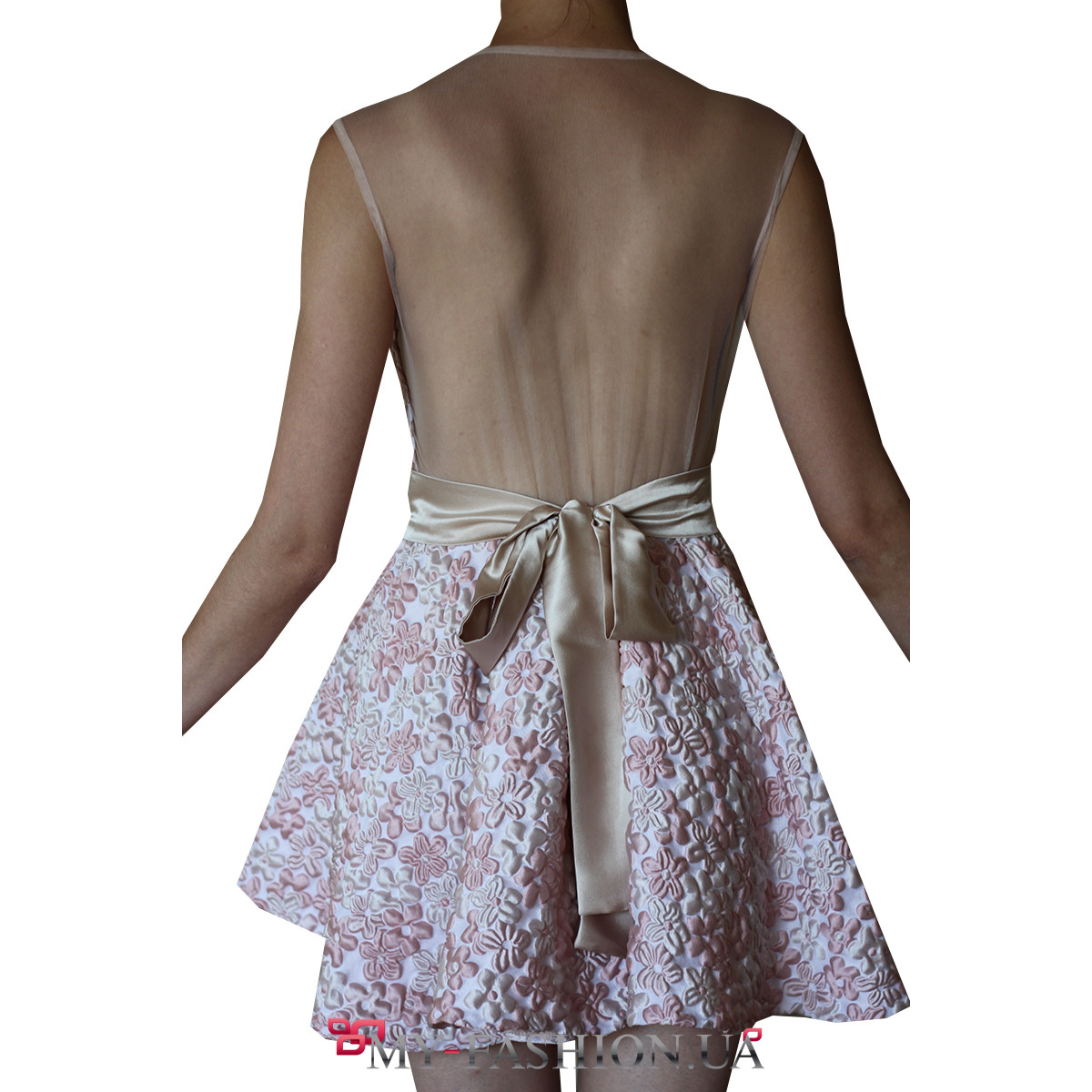 Короткое платье с открытой спинкой отлично подойдет для торжественных случаев. Шикарные объёмные мелкие цветы и пышная юбка создадут настоящую праздничную феерию, а сетка пастельного цвета на линии декольте и спинке придаст вам чувственности и женственности. Широкий светлый атласный пояс хорошо подчеркнёт талию. Платье будет шикарно смотреться со стильными босоножками на высоком каблуке и кожаной сумочкой. Доступно в разных размерах.
